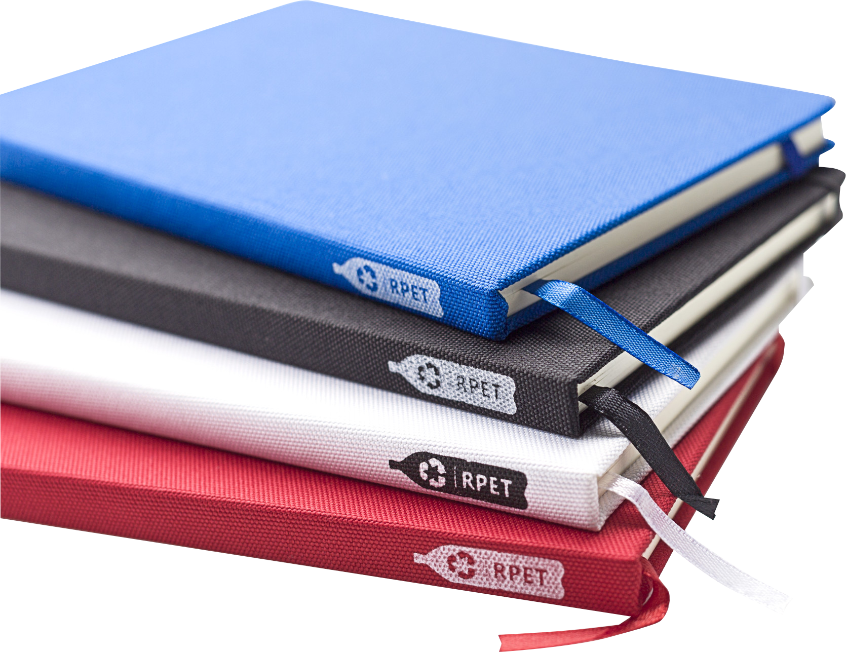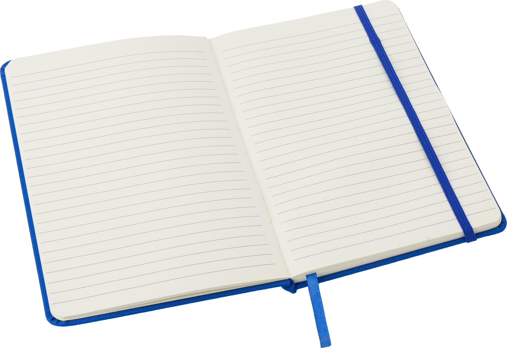 A5 RPET and PU Notebook with elastic closure and ribbon bookmark. Notebook has 80 lined pages of 70gsm paper.