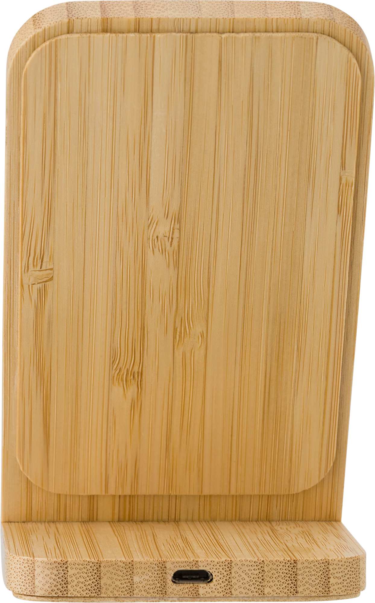 Bamboo phone holder with wireless charger (5W). Output DC5V/1A. Includes micro USB - USB charging cable.