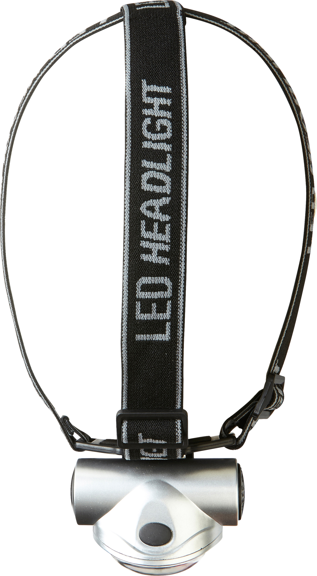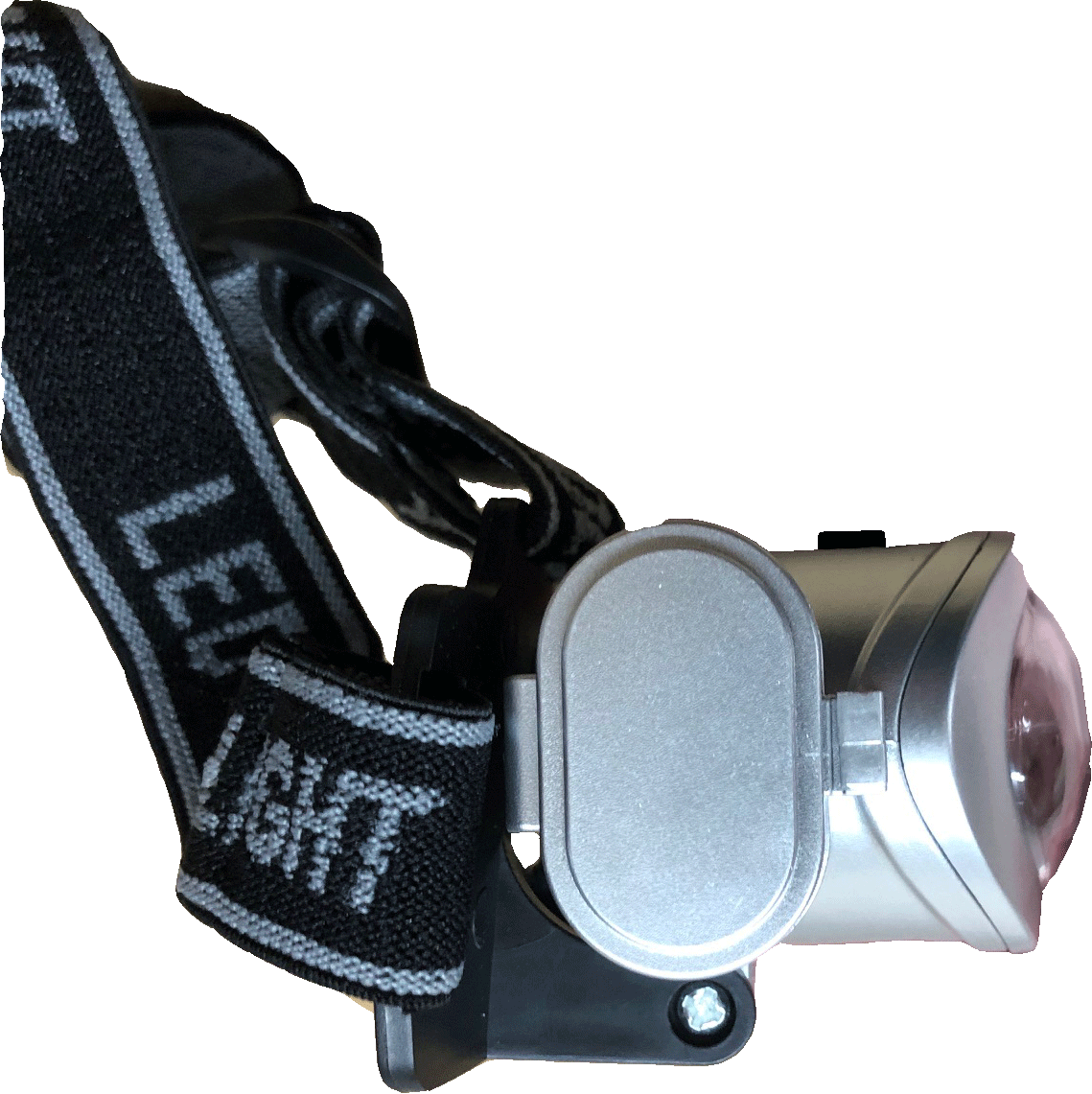 Head light with eight LED lights in a plastic casing and strap for size adjustments. Batteries included.