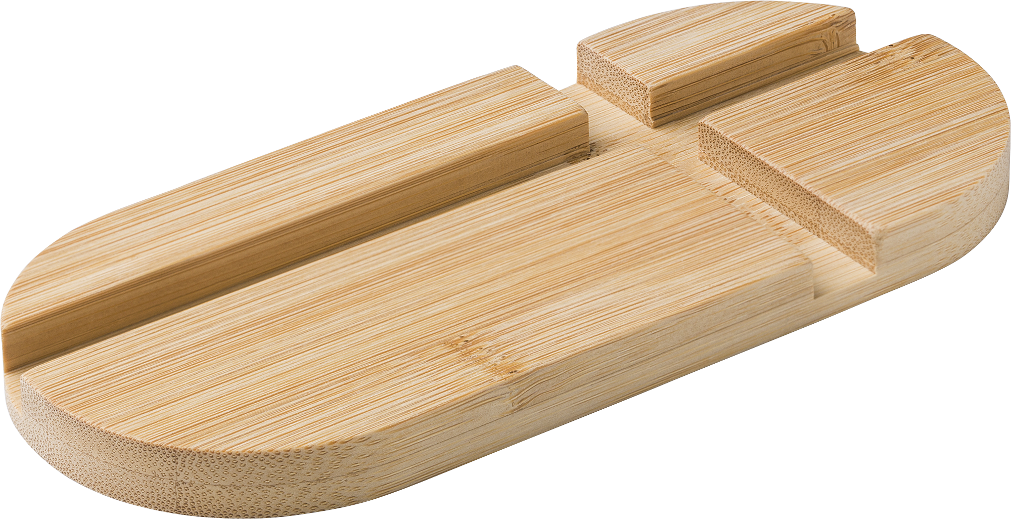 Bamboo phone and tablet holder with one centimetre cut-outs. Individually packaged in a brown cardboard box.