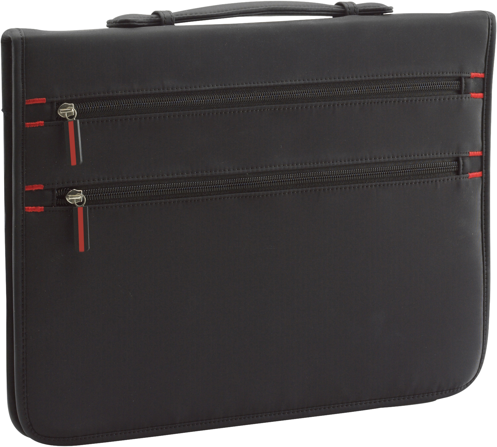 A4 PVC zipped portfolio with a four ring binder mechanism, calculator and twenty page lined writing pad with a pen holder, the front of the bag has two zipped pockets while the inside has one zipped pocket and slots for five credit cards (excludes pen).