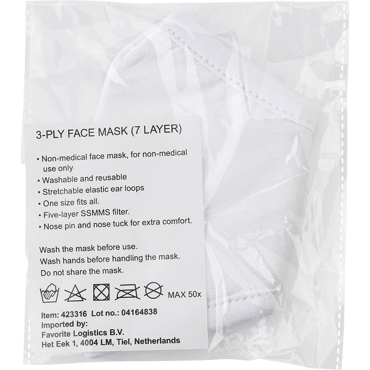Cotton reusable face mask with elastic straps. The seven-layer mask (Five-layer filter with Melt Blown SSMMS filter) has a bacterial filtration of 95%. Washable at 60 degrees. Non-medical.