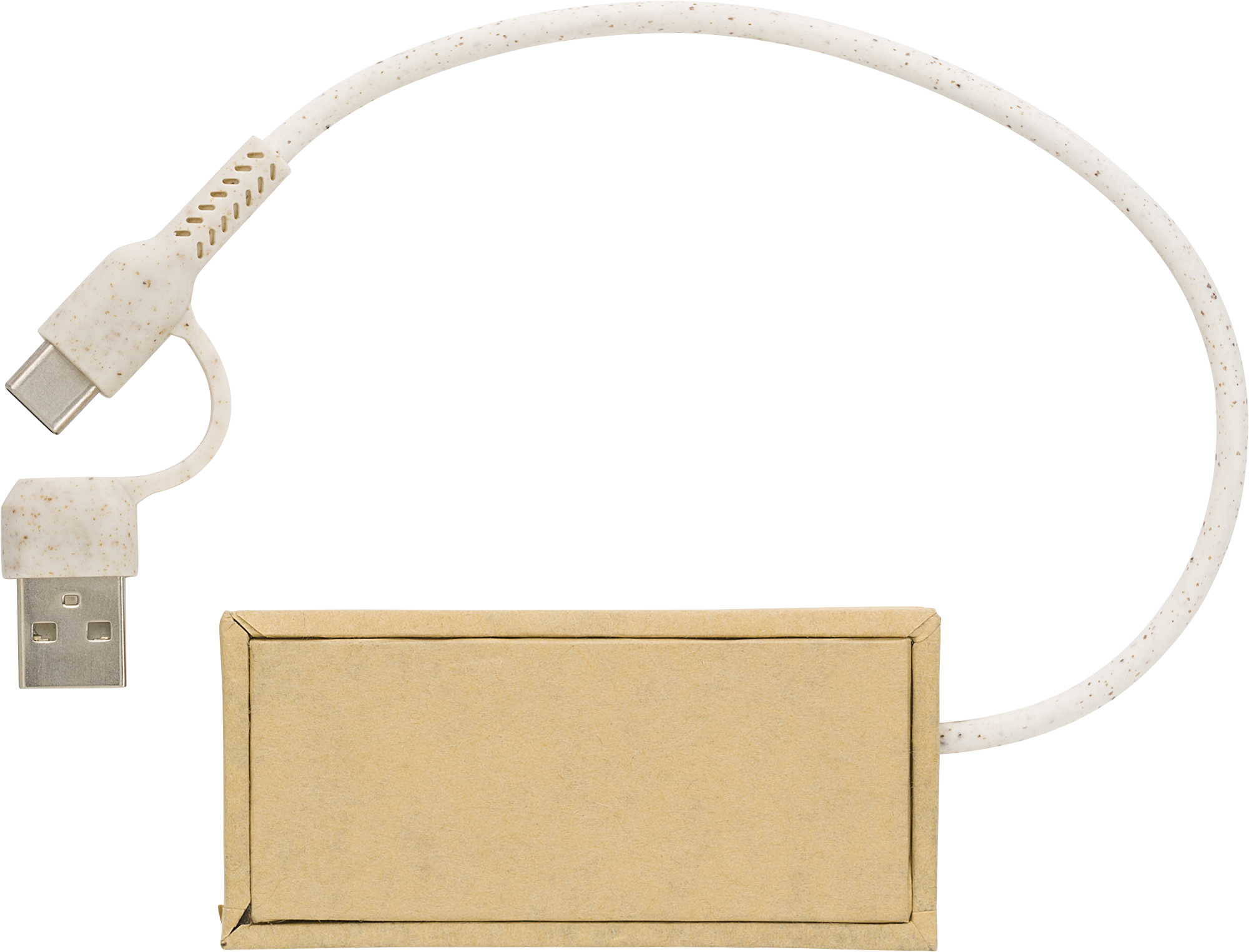 Aluminium and recycled paper USB (2.0) hub. Features two USB-C ports and two USB ports with USB-C input. Individually packaged in a brown cardboard box. Eco-friendly and practical for expanding connectivity.