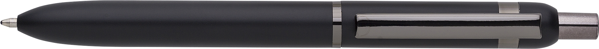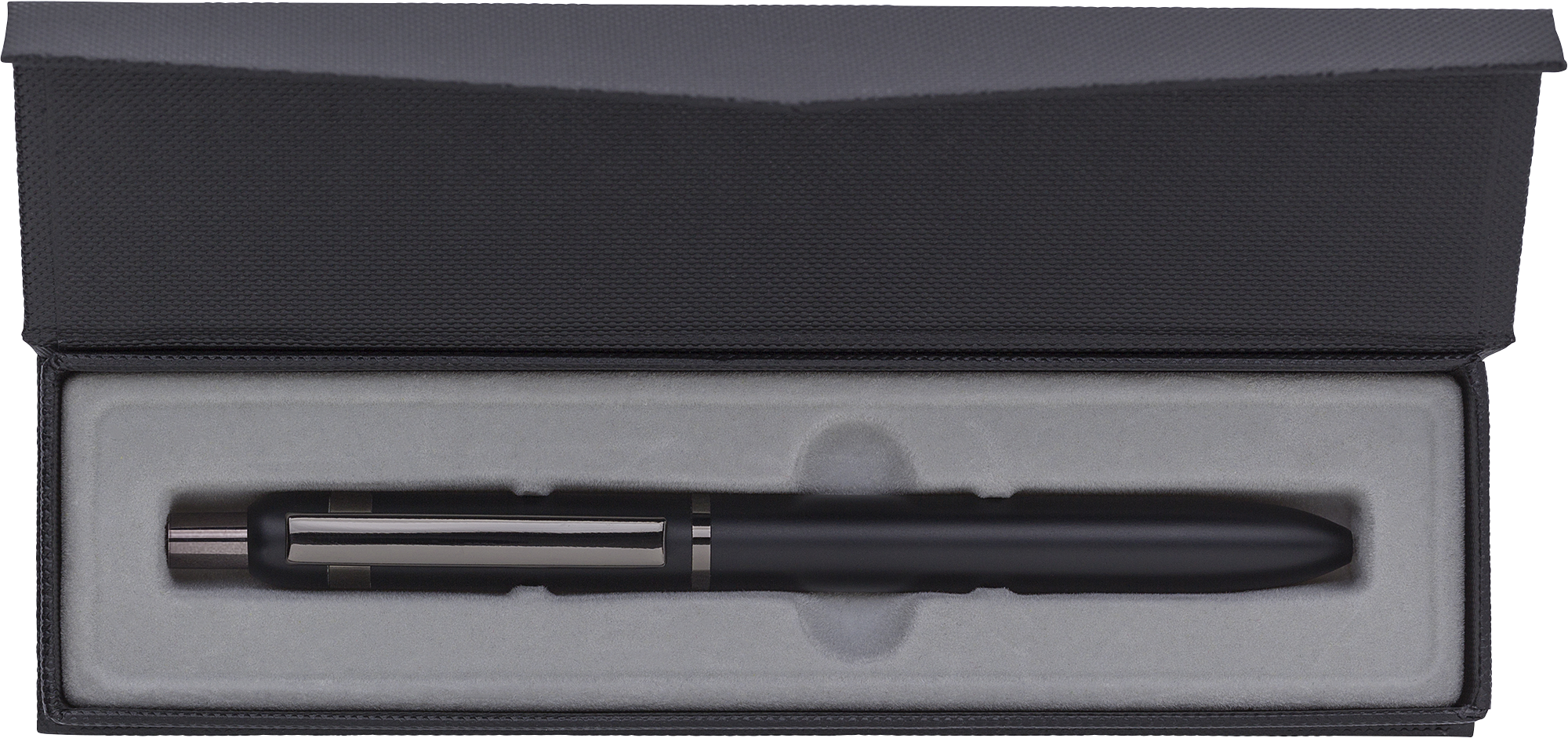 Aluminium and brass retractable ballpen with blue ink. Individually packaged in a magnetic gift box with paper sleeve.
