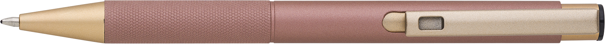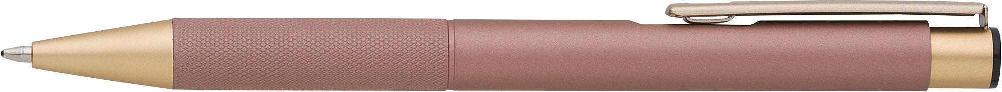 Aluminium, matte finished ballpen with a patterned grip, gold trim and blue ink.
