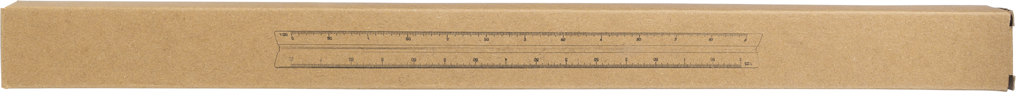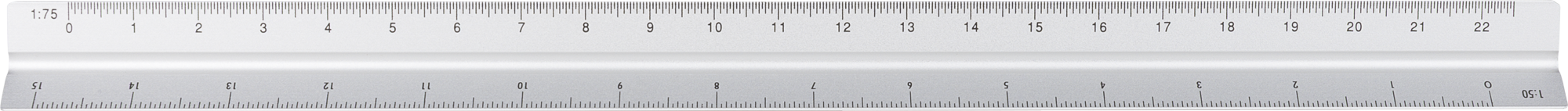 Aluminium 30cm triangular shaped ruler with measuring scales: 1:20, 1:25, 1:50, 1:75, and 1:100. and cm and inches. One side without scale for personalization. Individually packaged in a brown box.