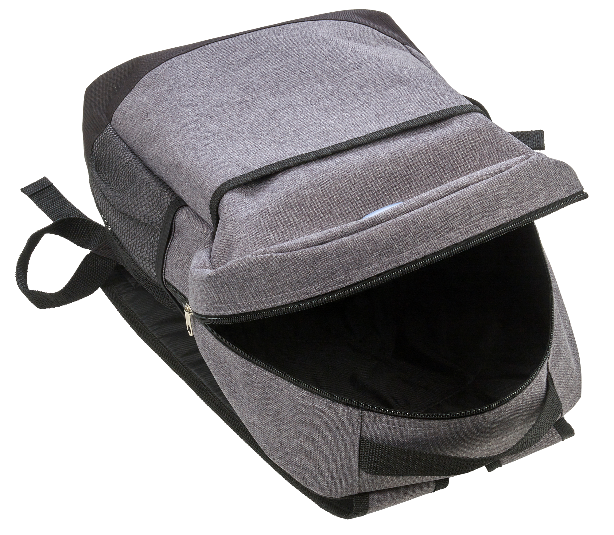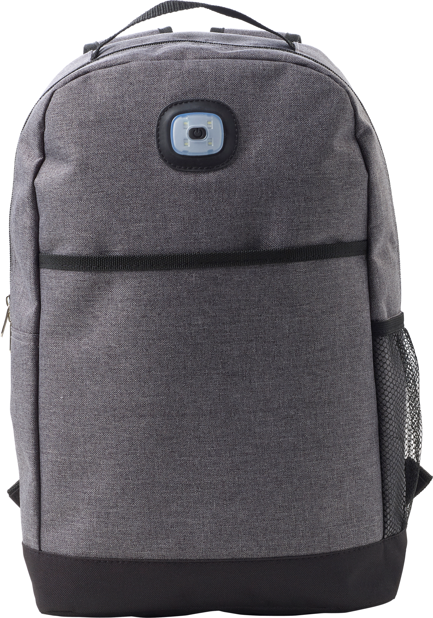Polyester (300D + 210D) backpack with adjustable and padded shoulder straps, a large main compartment, front pocket and mesh side pocket. The backpack has a COB light with two functions. Batteries included.