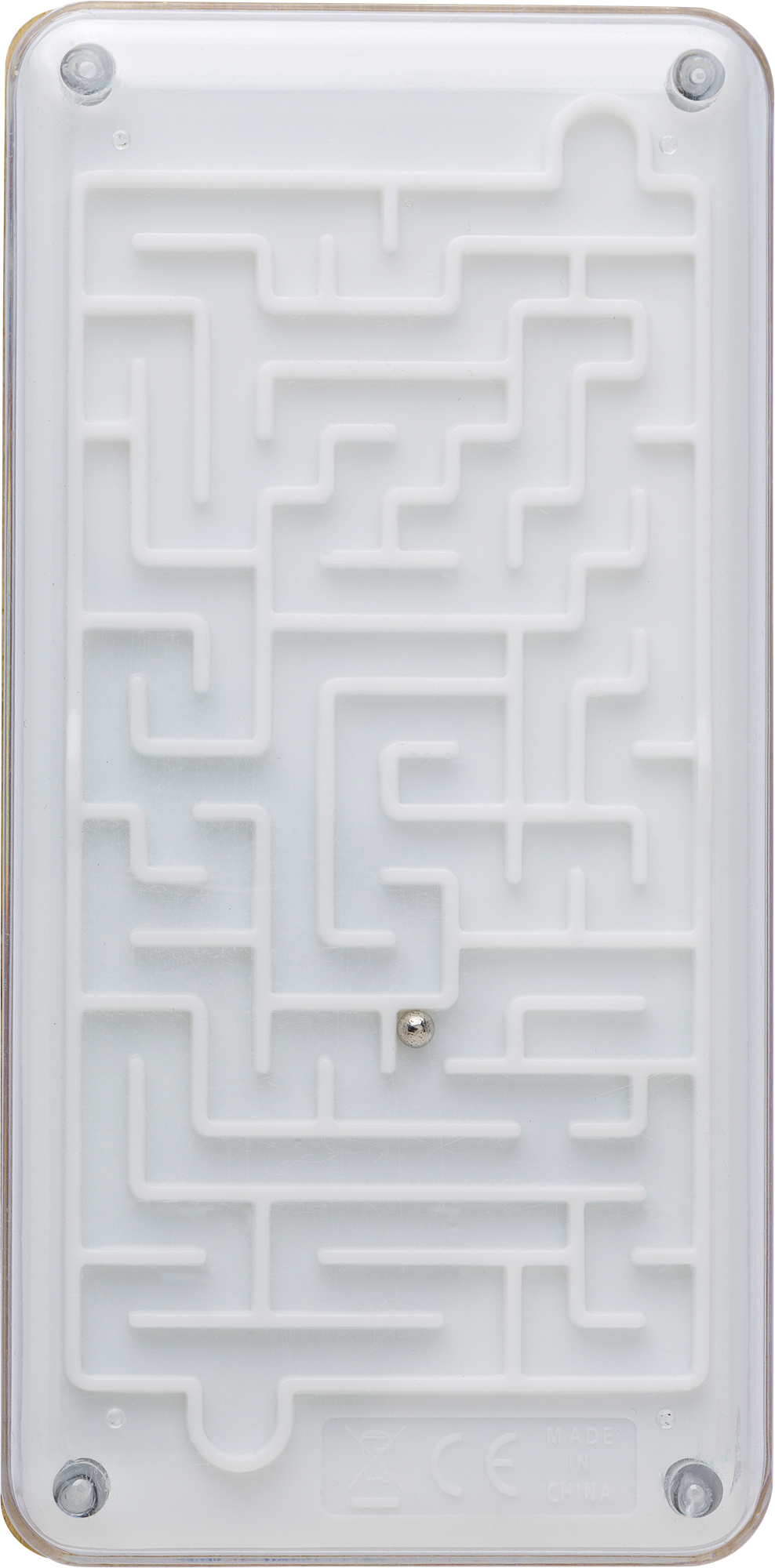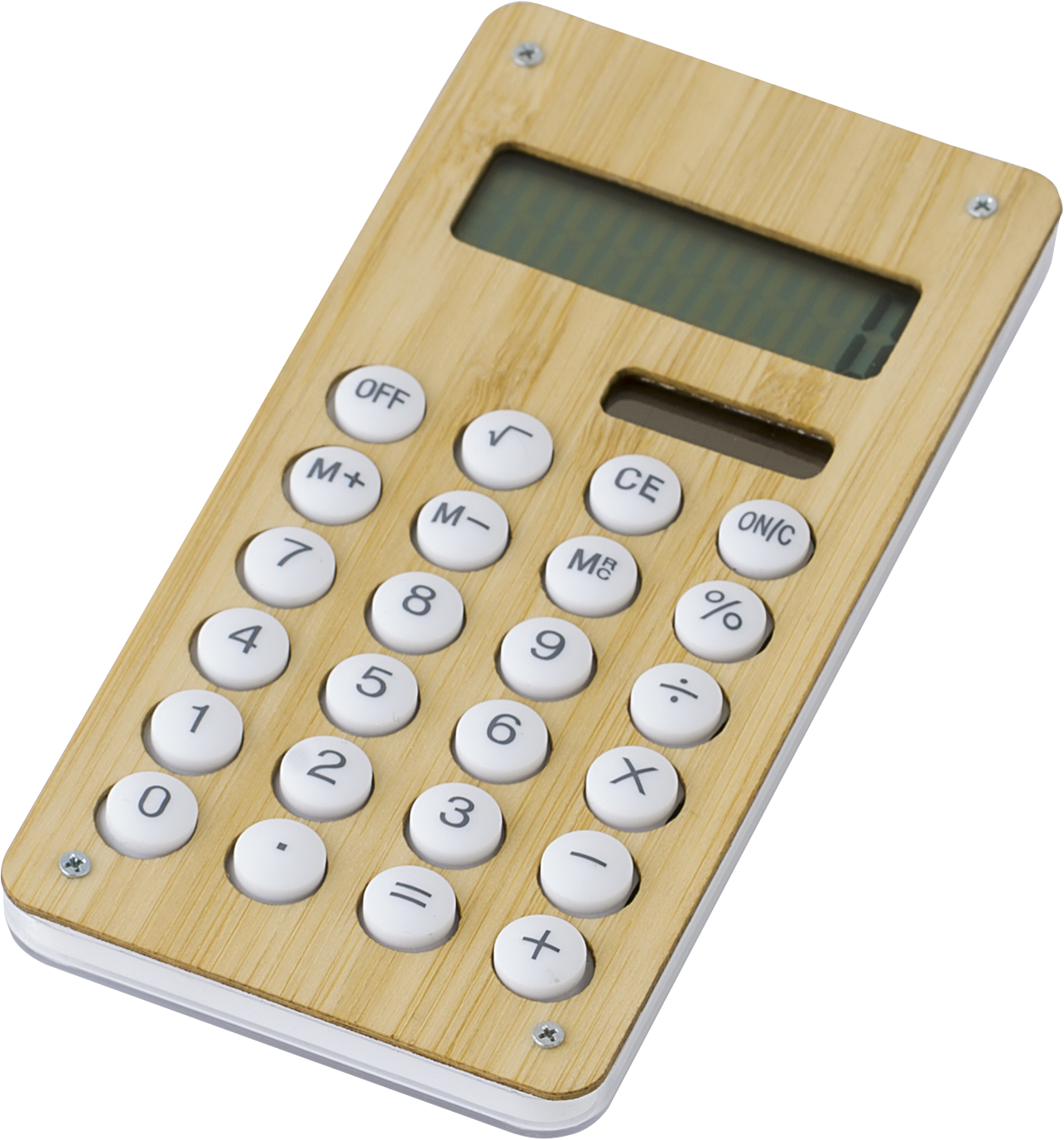 Bamboo and plastic calculator with a ball maze game on the back, displays up to 8 digits.