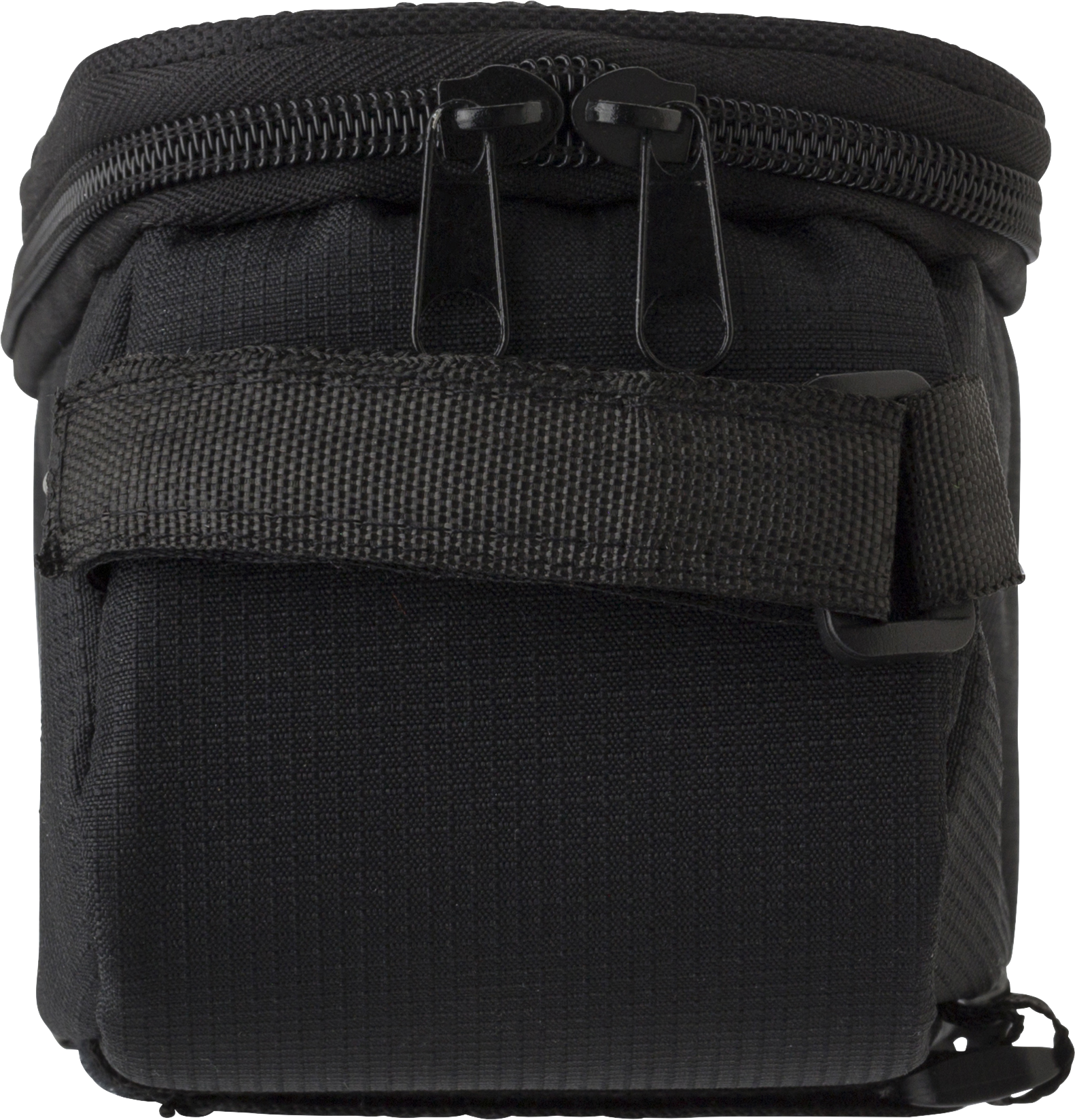 Bicycle handle bar bag with separate compartment on top for a mobile phone. The touch screen of the phone can still be used through the PVC cover. On one side there is an opening to pull the cable of earphones through.