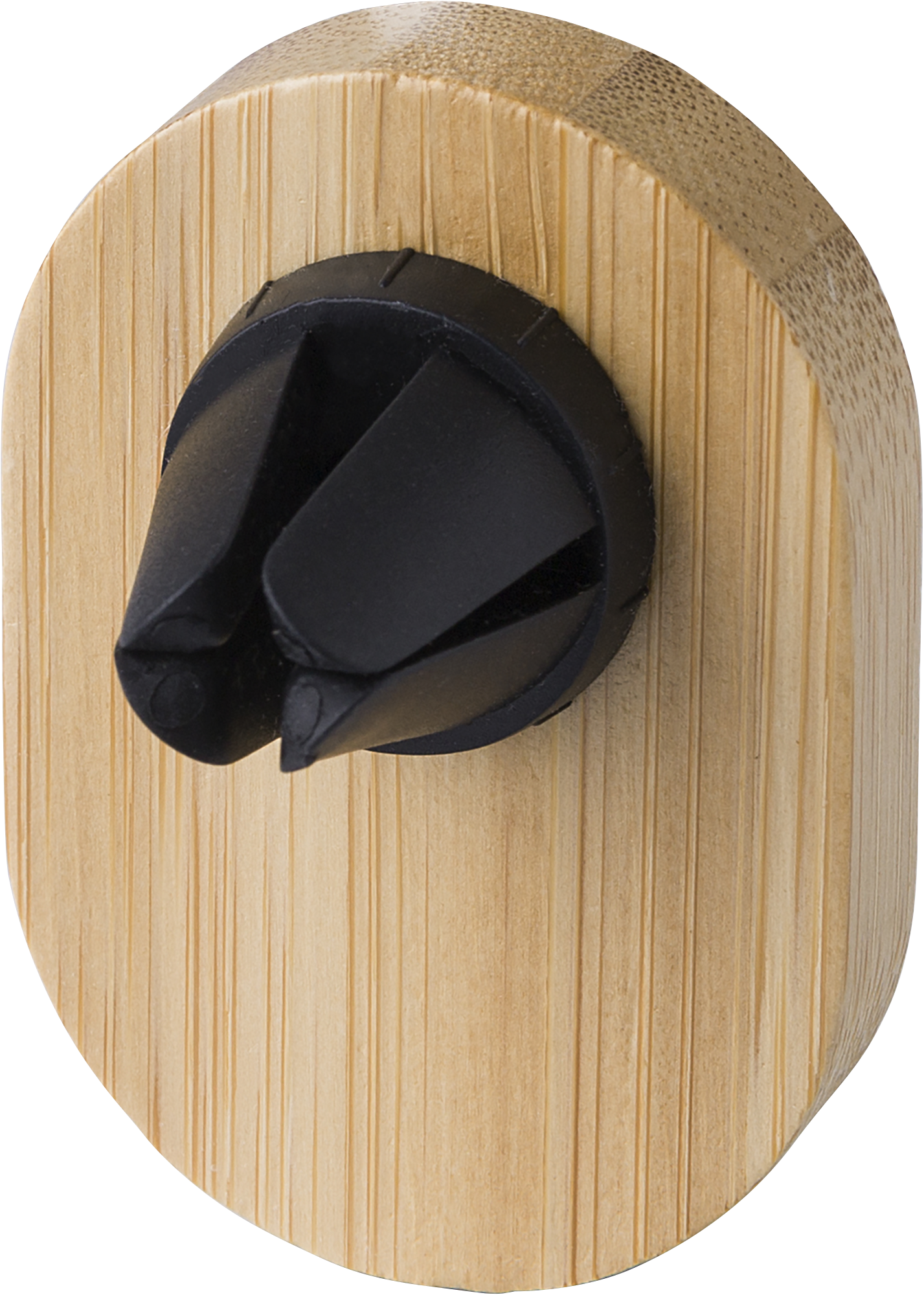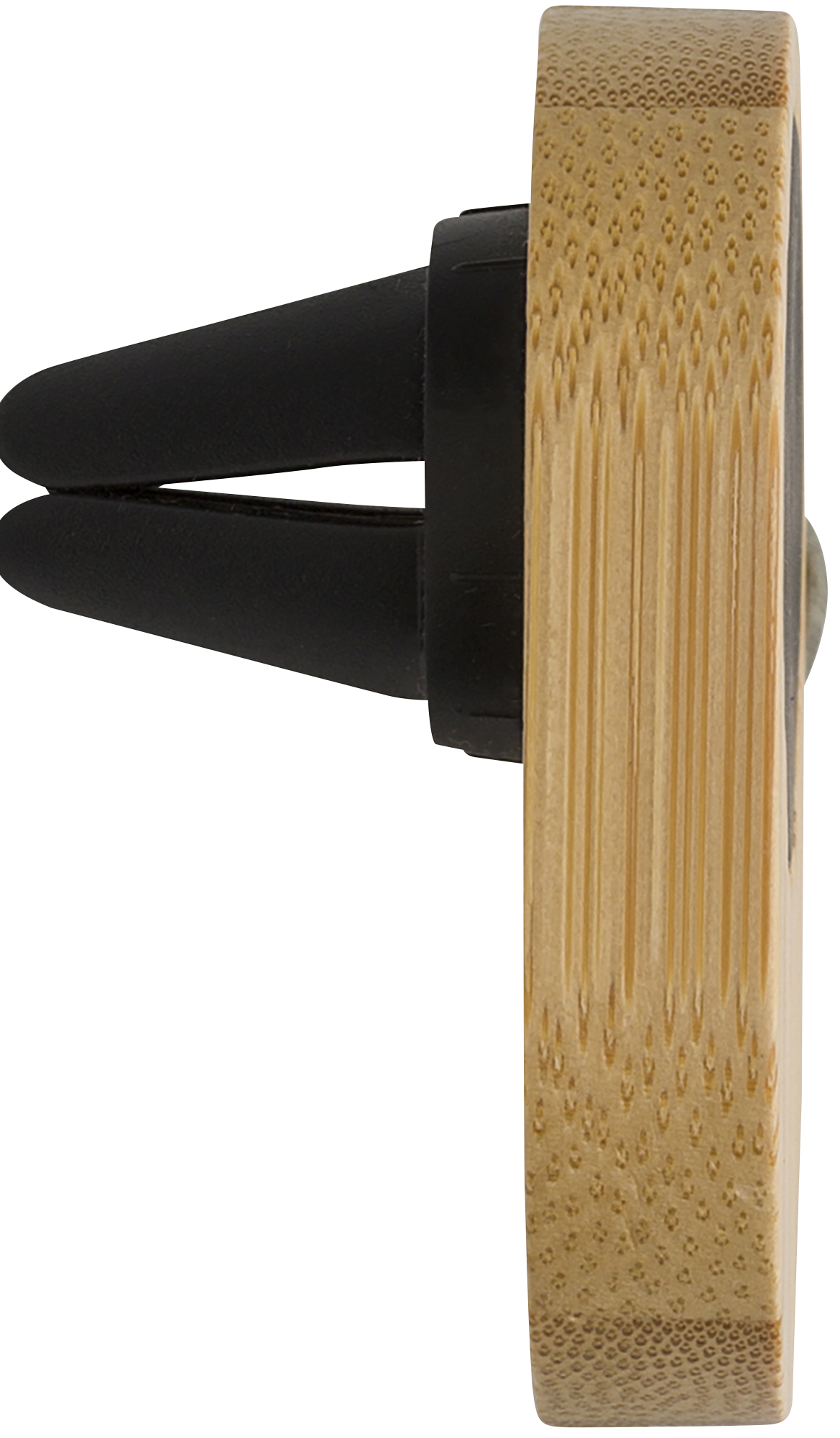 Bamboo phone holder for in-car use, can be attached to a ventilator. Supplied with a magnetic sticker to attach the phone. Individually packaged in a brown cardboard box.