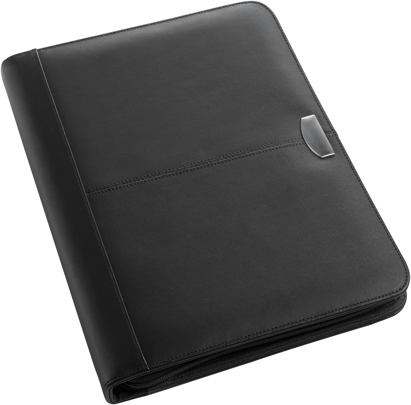 A4 Bonded leather zipped conference folder with various pockets, a note pad, an elasticated pen loop (excludes pen) and a metal engraving plate.