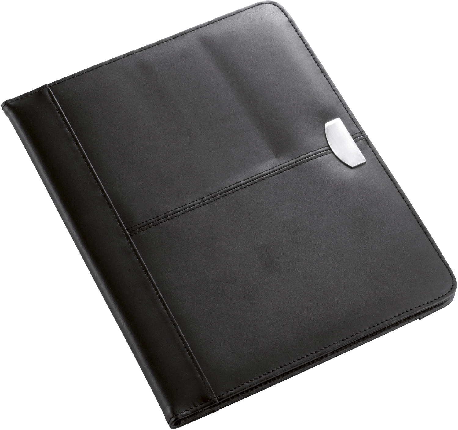 A4 Bonded leather conference folder with various pockets, a note pad, an elasticated pen loop (excludes pen) and metal engraving plate.