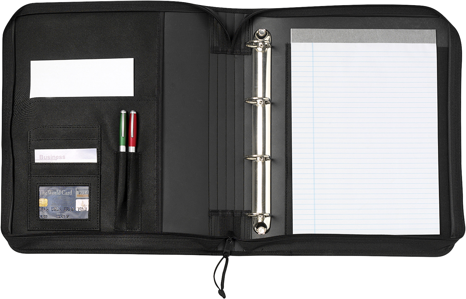 A4 Polyester conference portfolio (600D) with a four ring mechanism, note pad and document case with attached files case (excludes pens).