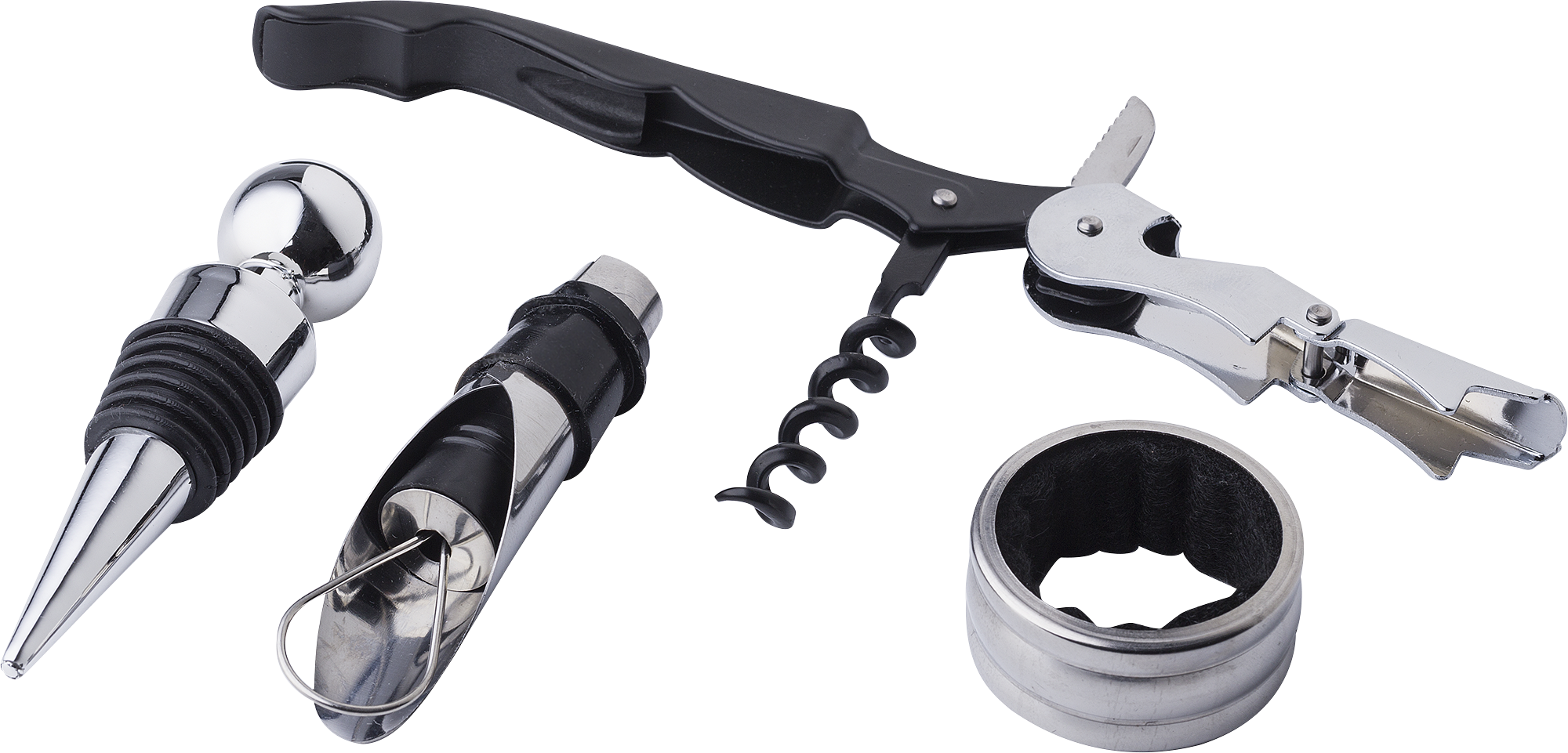 Cork wine set with 4 accessories. Includes a waiters knife, bottle stop, drip catcher and a pouring spout. Individually packaged in a brown cardboard box.