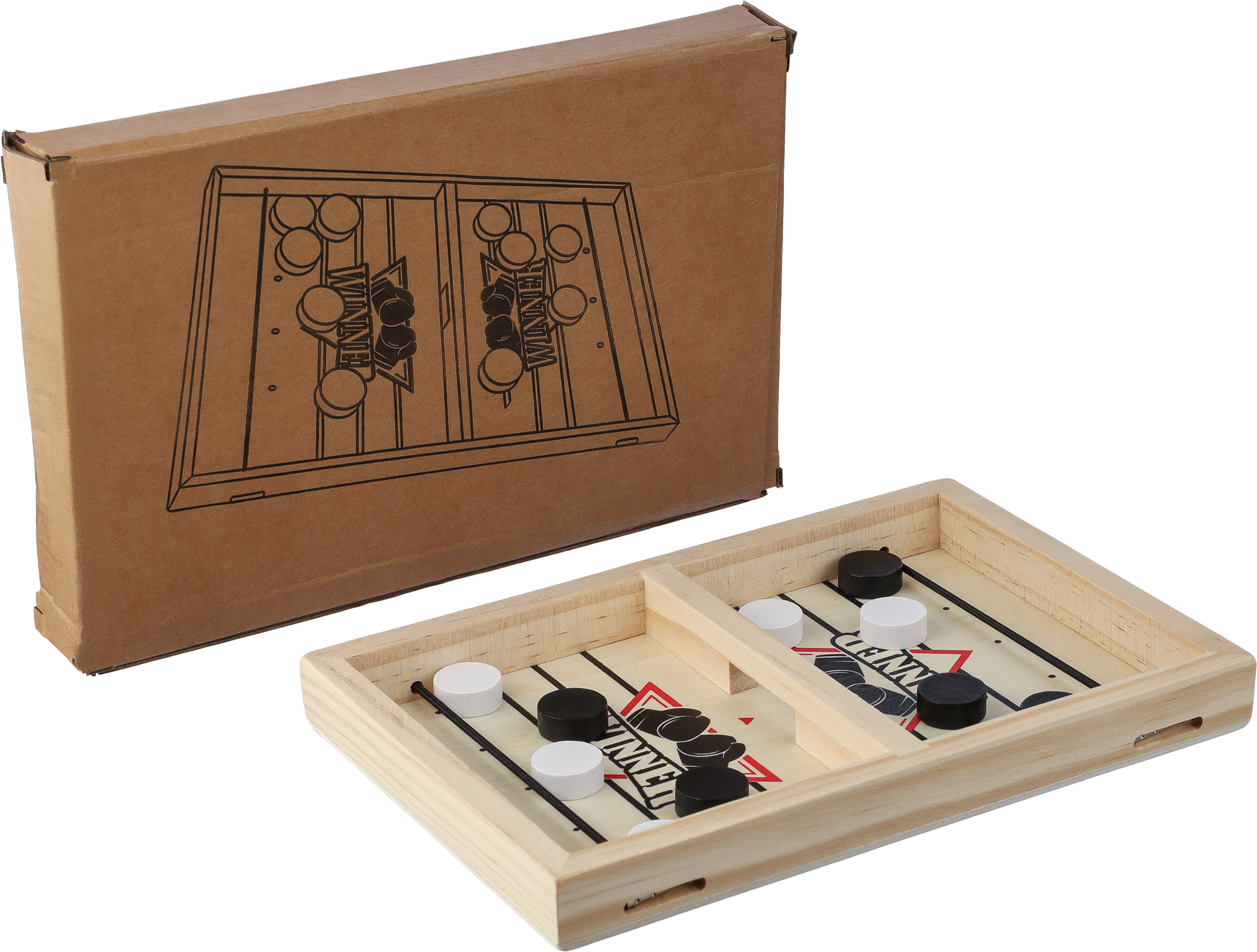 Wooden Fast Sling Puck game. Includes 10 chess chips and a manual for easy setup and play. A fast-paced skill game for adults Individually packaged in a brown cardboard box with an illustrated front.