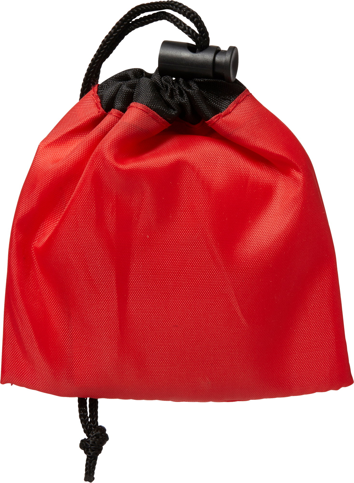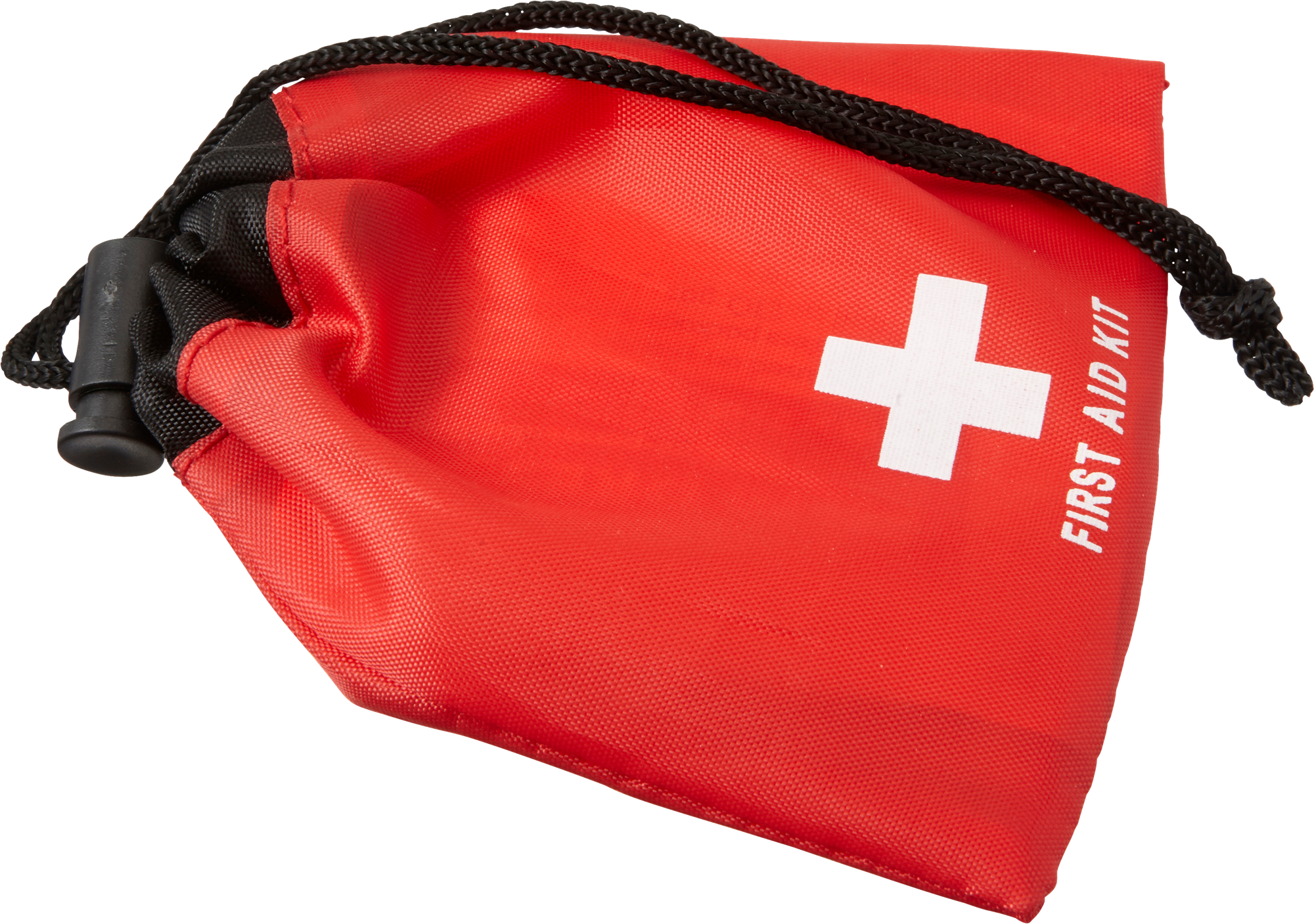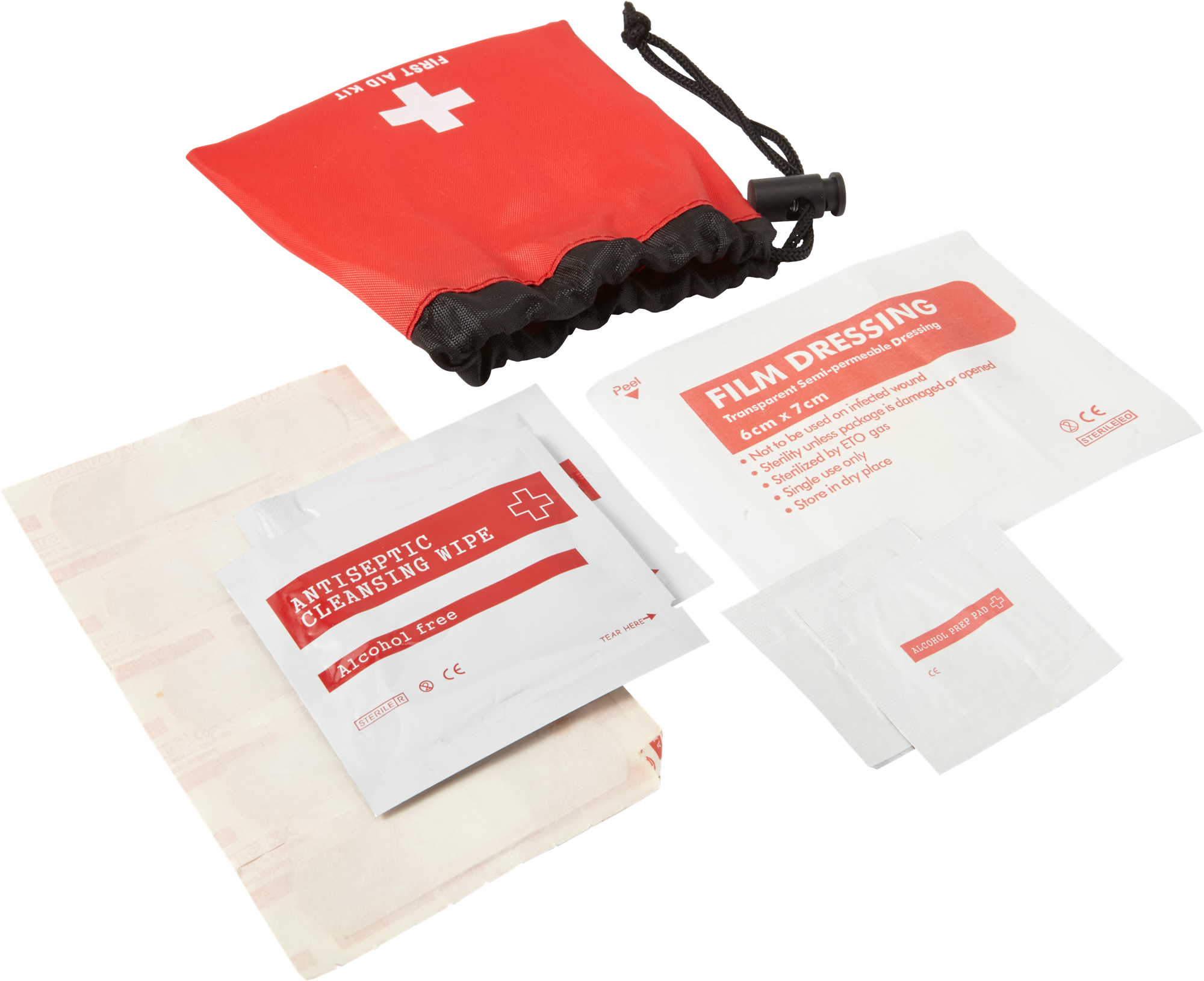 First aid kit in a drawstring pouch. Including five plasters, two alcohol pads, one damp cloth, once disinfectant cloth and one bandage