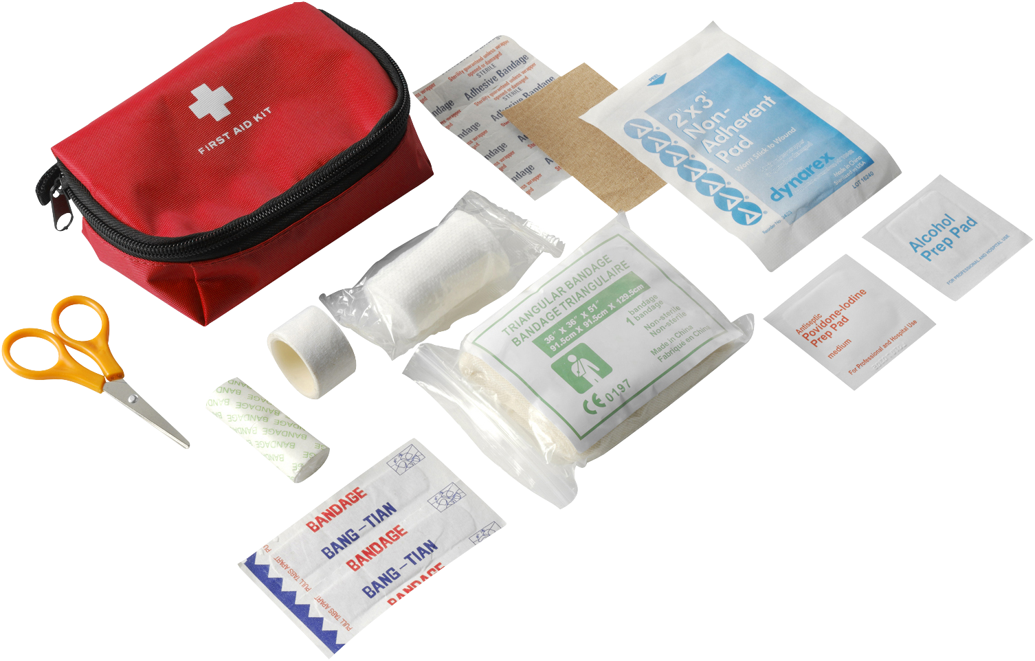 First aid kit (16pc) in a nylon pouch (600D). This kit includes: flexible bandage, a roll of bandages, a pair of scissors, a prep pad, an alcohol pad, a pad, a bandage with two safety pins, five bandages, and a roll of gauze.
