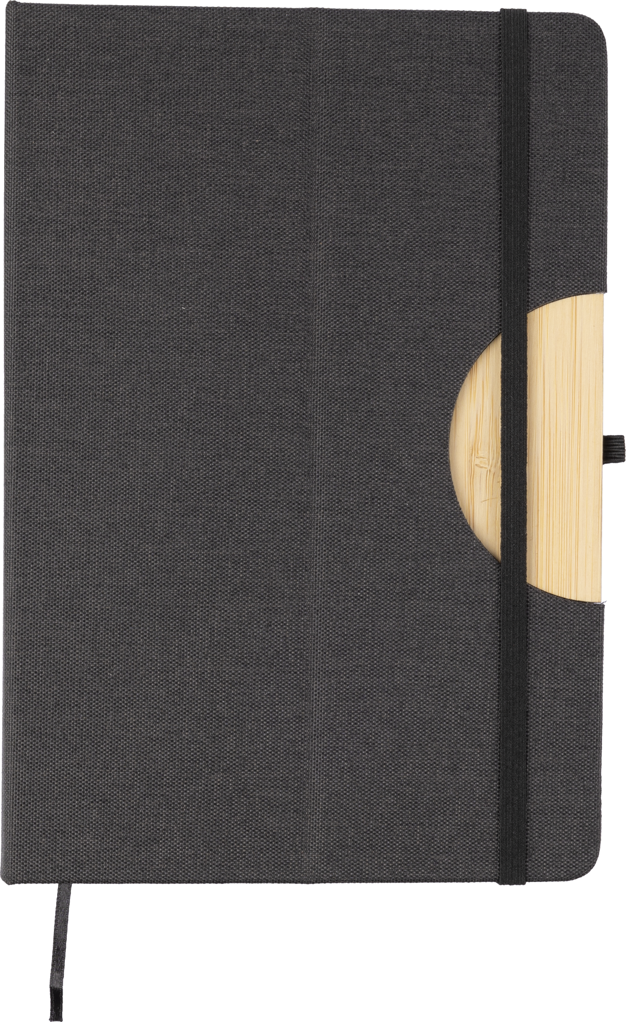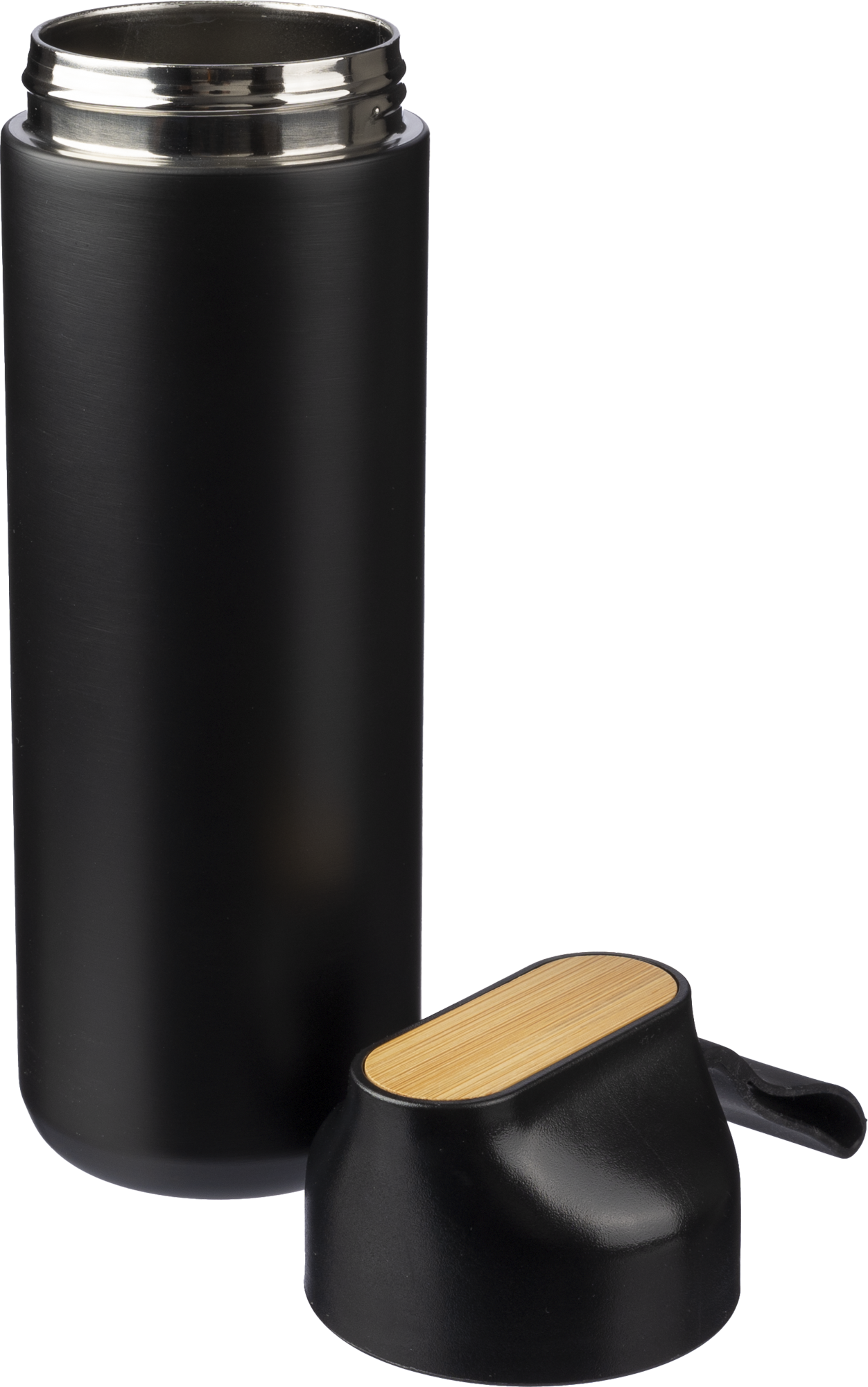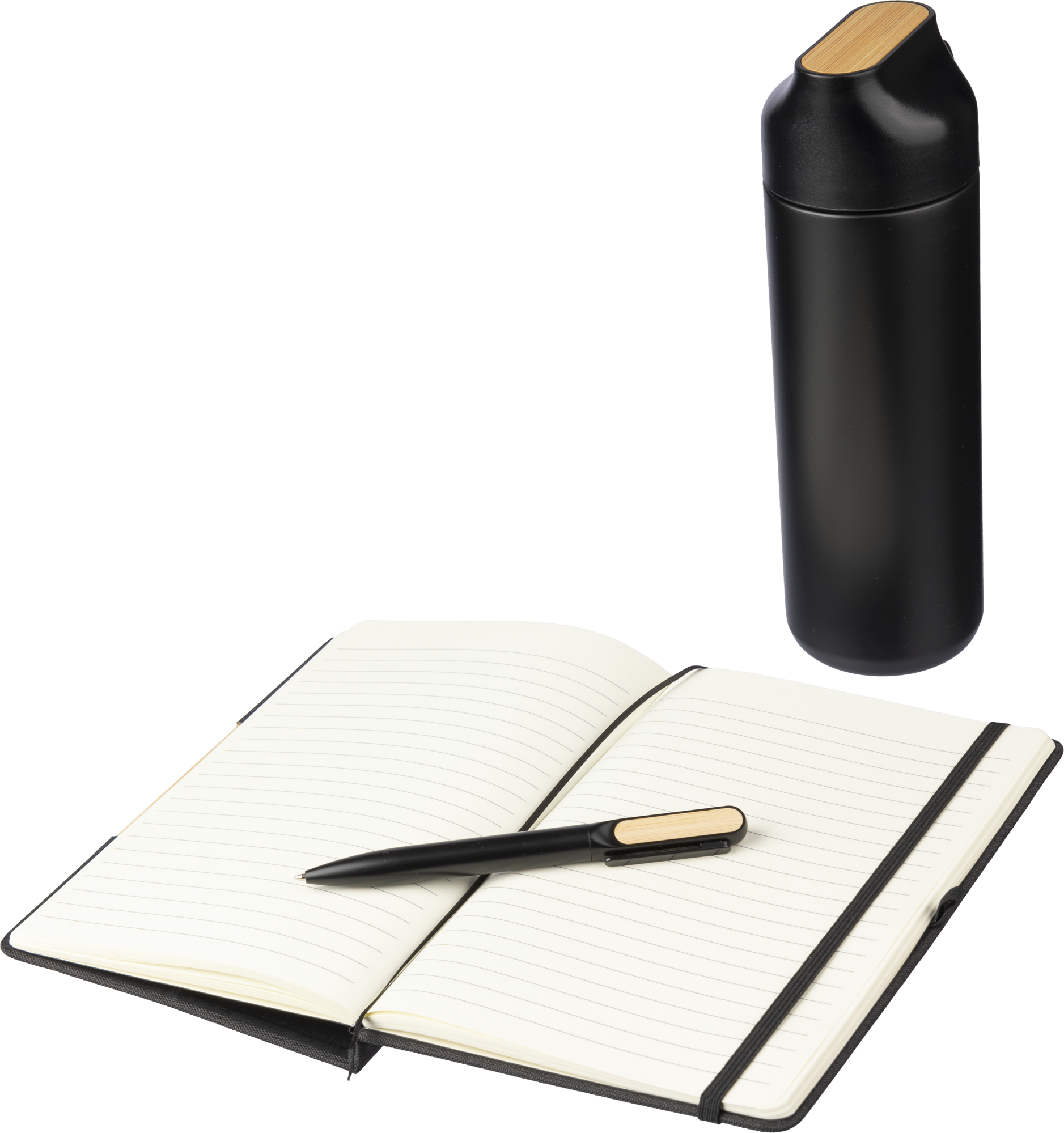 Gift set with a stainless steel vacuum-insulated double-walled drinking bottle (640 ml) with a bamboo inlayed PP lid, an aluminium twist action ballpen with a bamboo inlayed clip, and blue ink. Also a RPET 300D notebook (approx. A5) with 80 lined pages and bamboo detailed foldable cover which can be used as a phone holder. Presented in a black gift box. Not dishwasher safe.