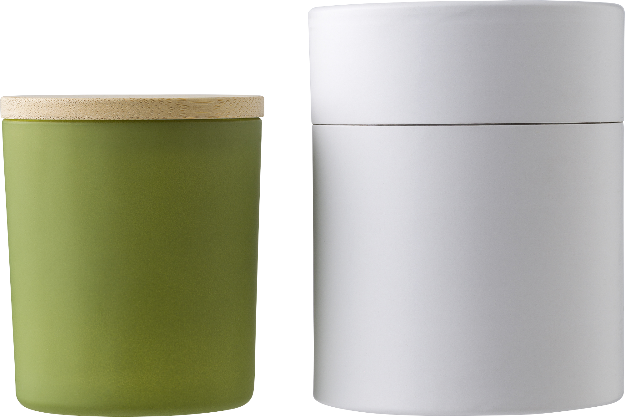 Introducing our Glass candle with plant-based wax and bamboo lid. Four delightful scents: cinnamon (red), vanilla (white), sandalwood (black), and jasmine (green). Enjoy up to 46 hours of burn time. Individually packed in a white tube. Elevate your ambiance sustainably with these captivating candles.