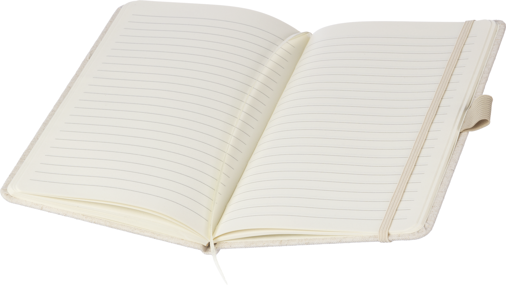 Hemp notebook (approx. A5) with 80 pages, featuring a pen loop, elastic band and a ribbon marker in a matching natural colour. Includes a hemp logo on the backside of the cover.