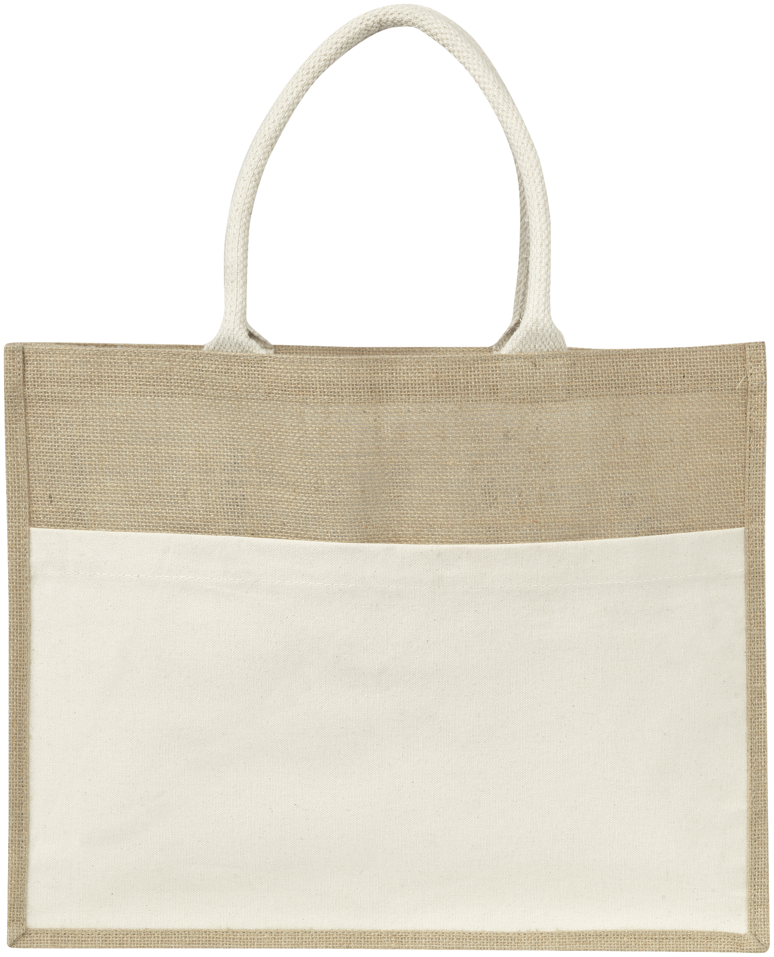 Jute bag with plastic backing, a cotton front pocket, and soft padded carry handles. 288g/10.1oz