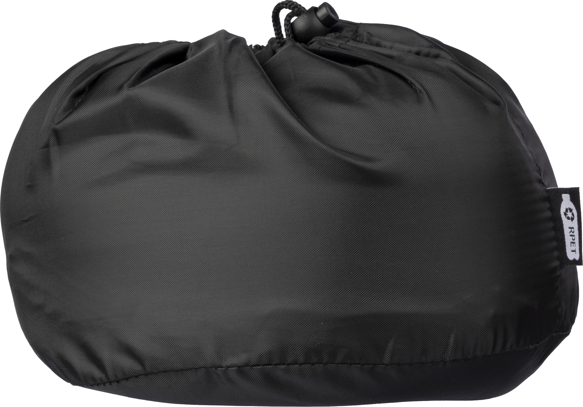 Memory foam travel pillow with adjustable cord and packaged in an RPET pouch.