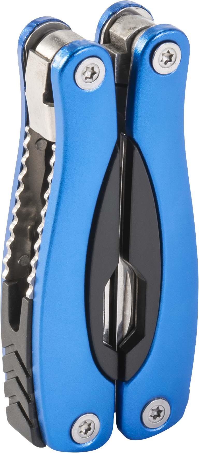 Metal multifunctional tool with ABS accents. The tool consists of a pair of pliers, a saw, a knife, two screwdrivers (one flat-head and one Philips), a file, a bottle opener, a fish scraper, a nutcracker and a ruler in inches. In pouch.