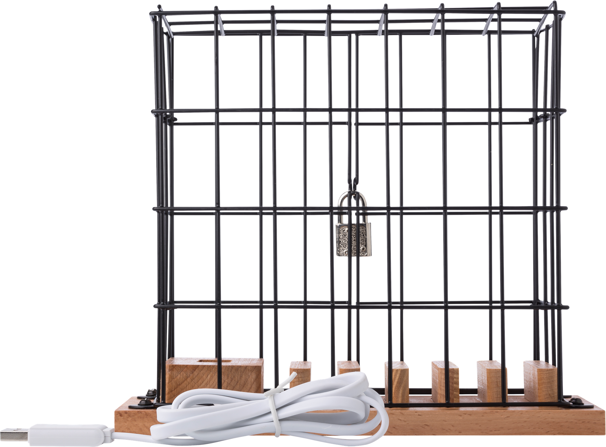 Aluminium and wooden phone holder cage, including USB ports and lock with two small keys.