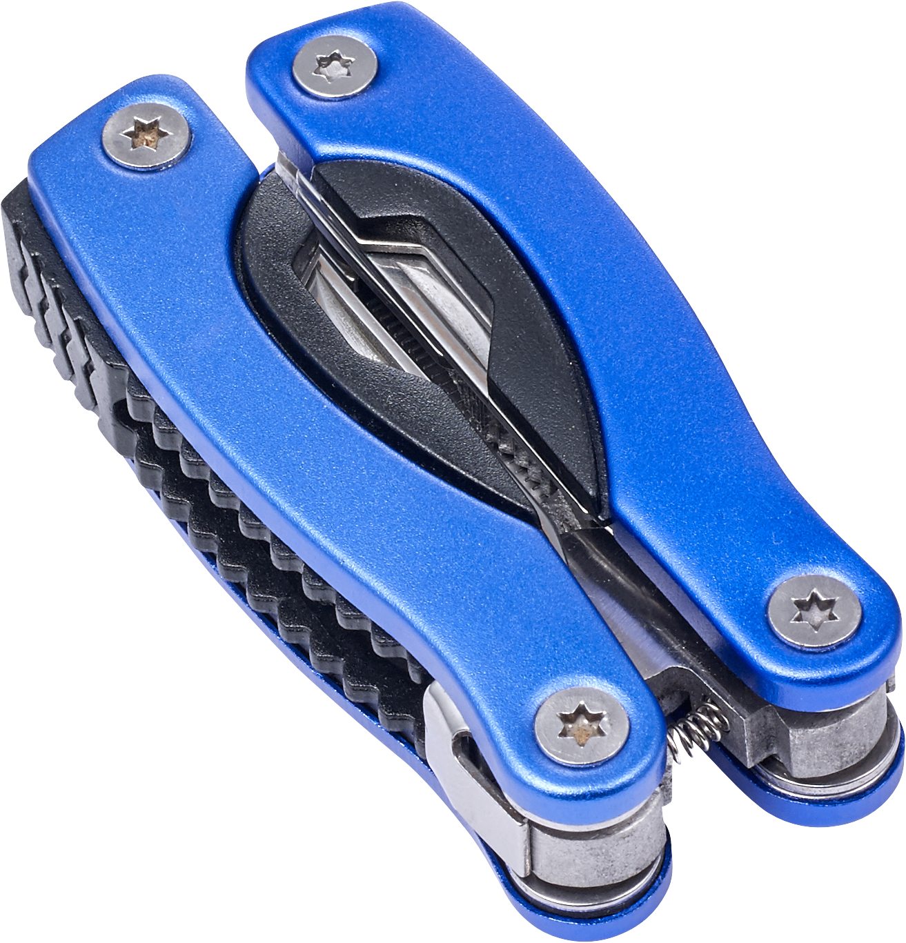Compact stainless steel multifunctional tool which folds open into a pair of pliers. Several tools are folded into the handles: screwdrivers (flat-head and Philips), file, saw, knife, nutcracker, can opener and bottle opener.