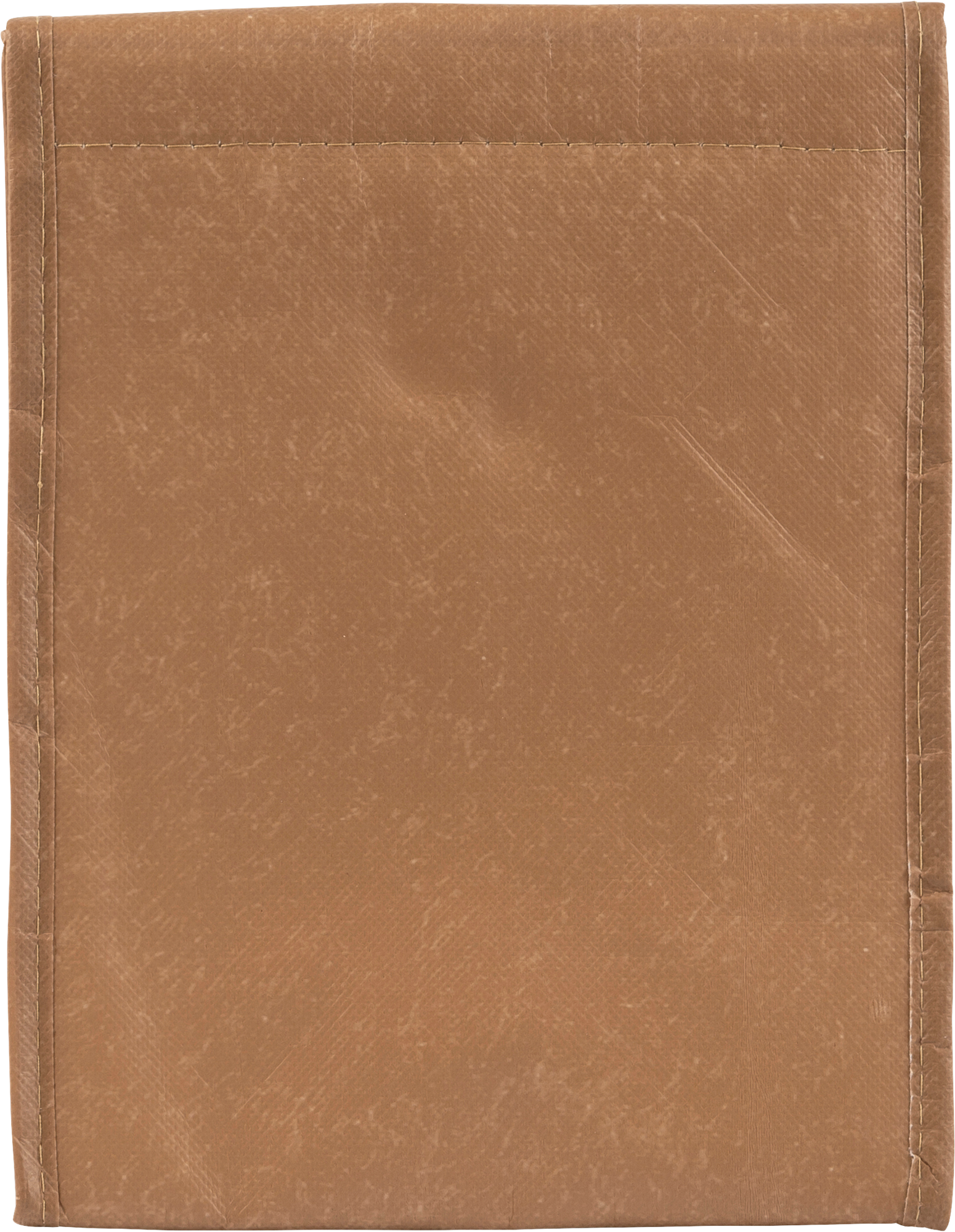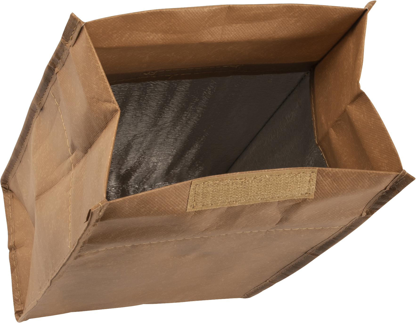 Cooling bag made of laminated nonwoven (100 gr/m²), looks like a brown paper bag. The interior is lined with insulating foil. Size: 19 x 32 x 12 cm.