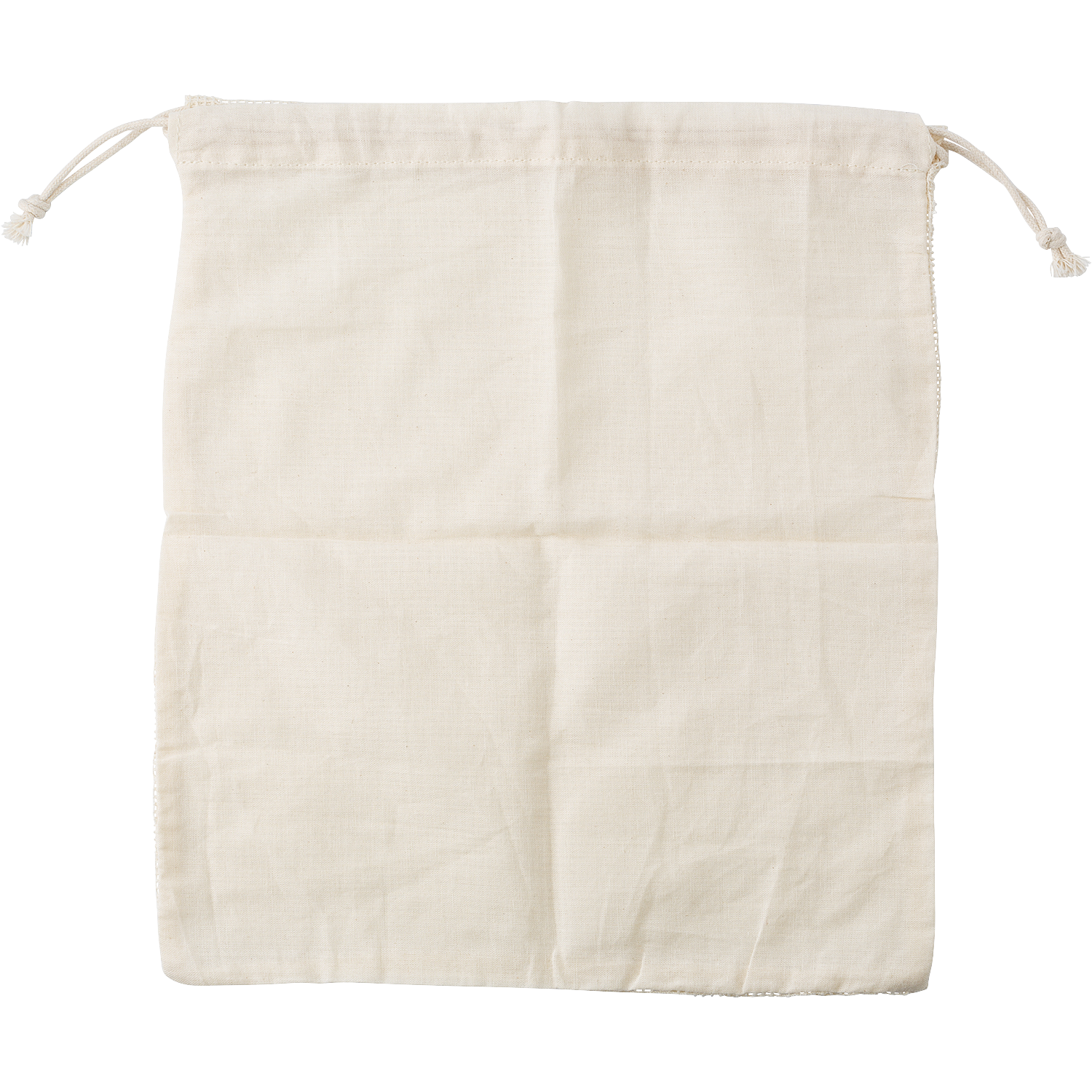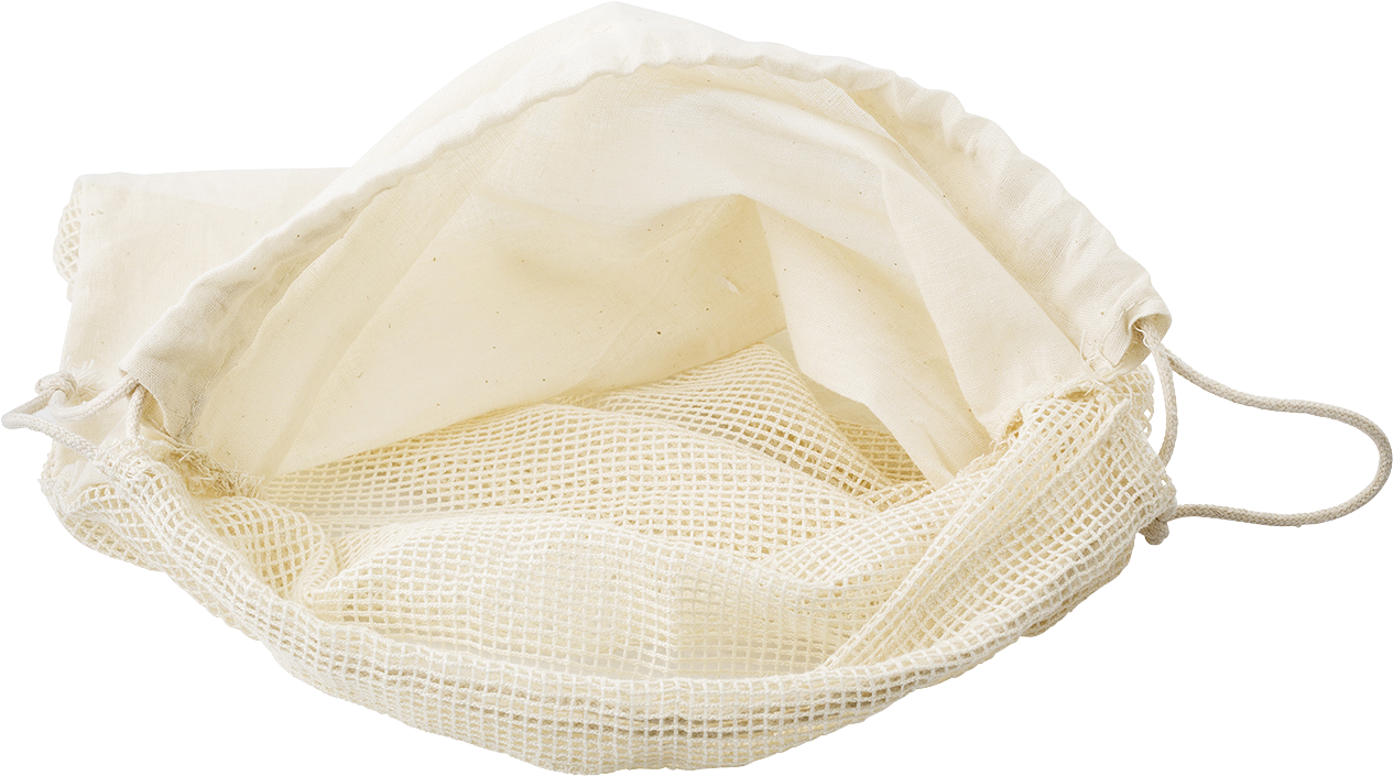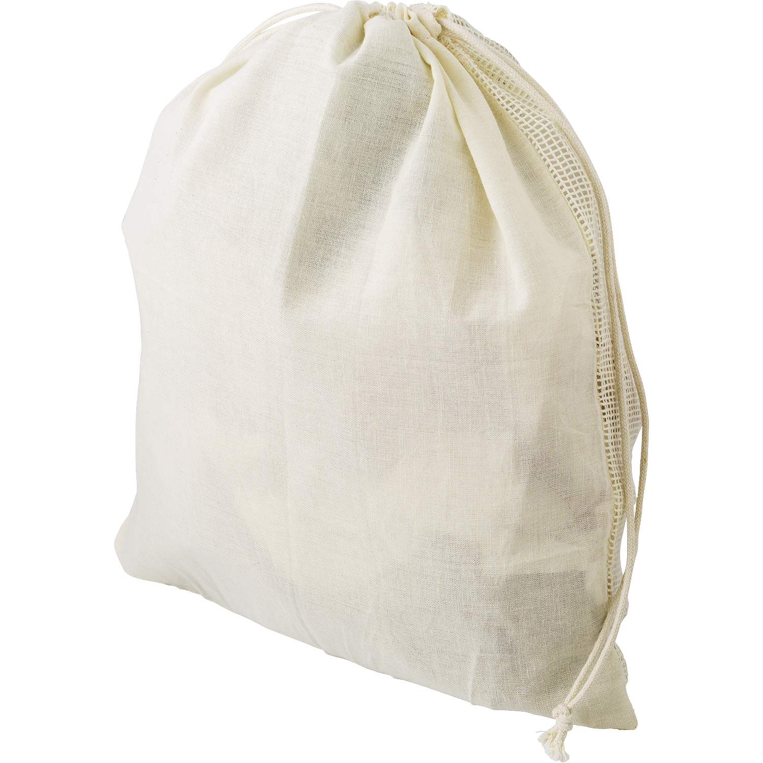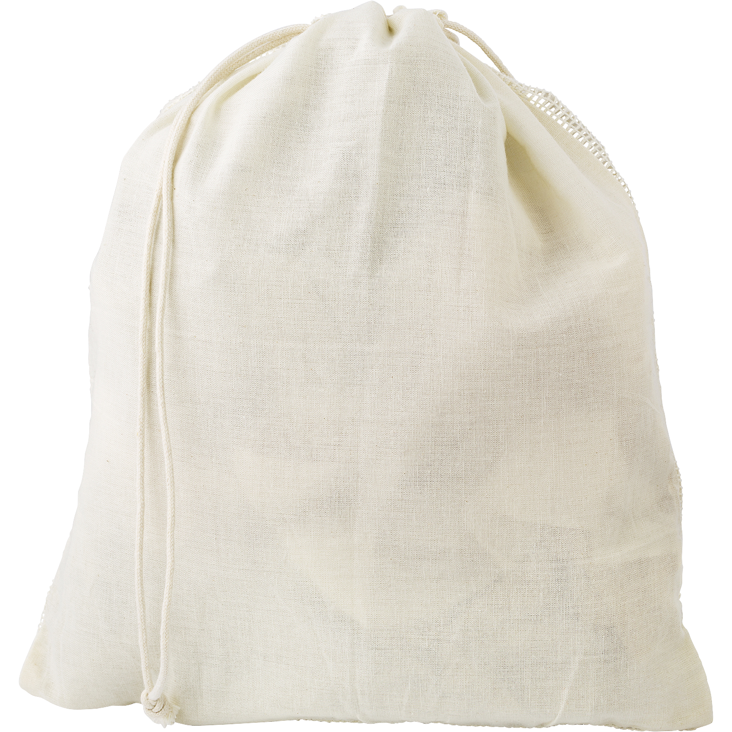 Organic cotton drawstring bag of which one side is cotton and the second side, mesh