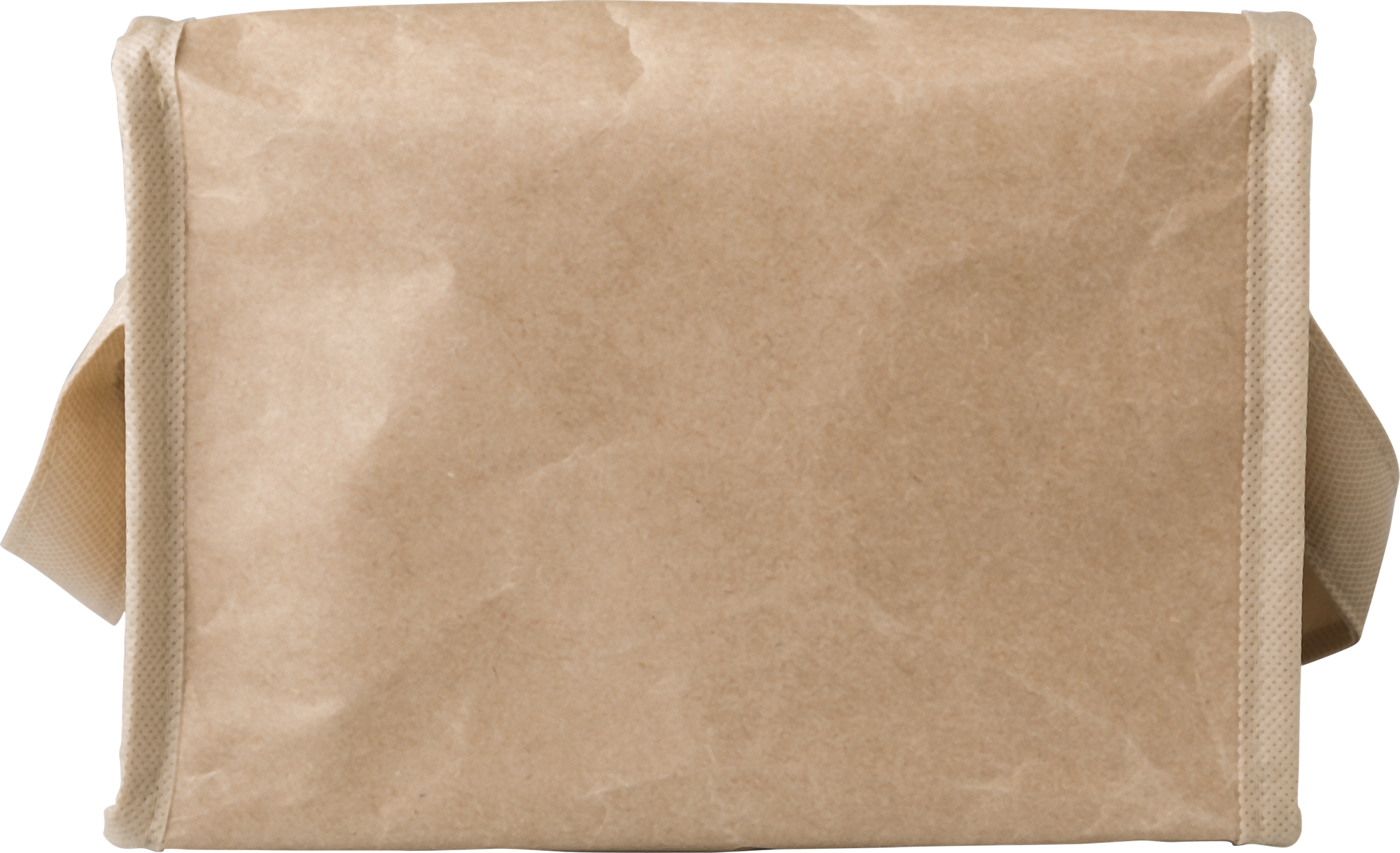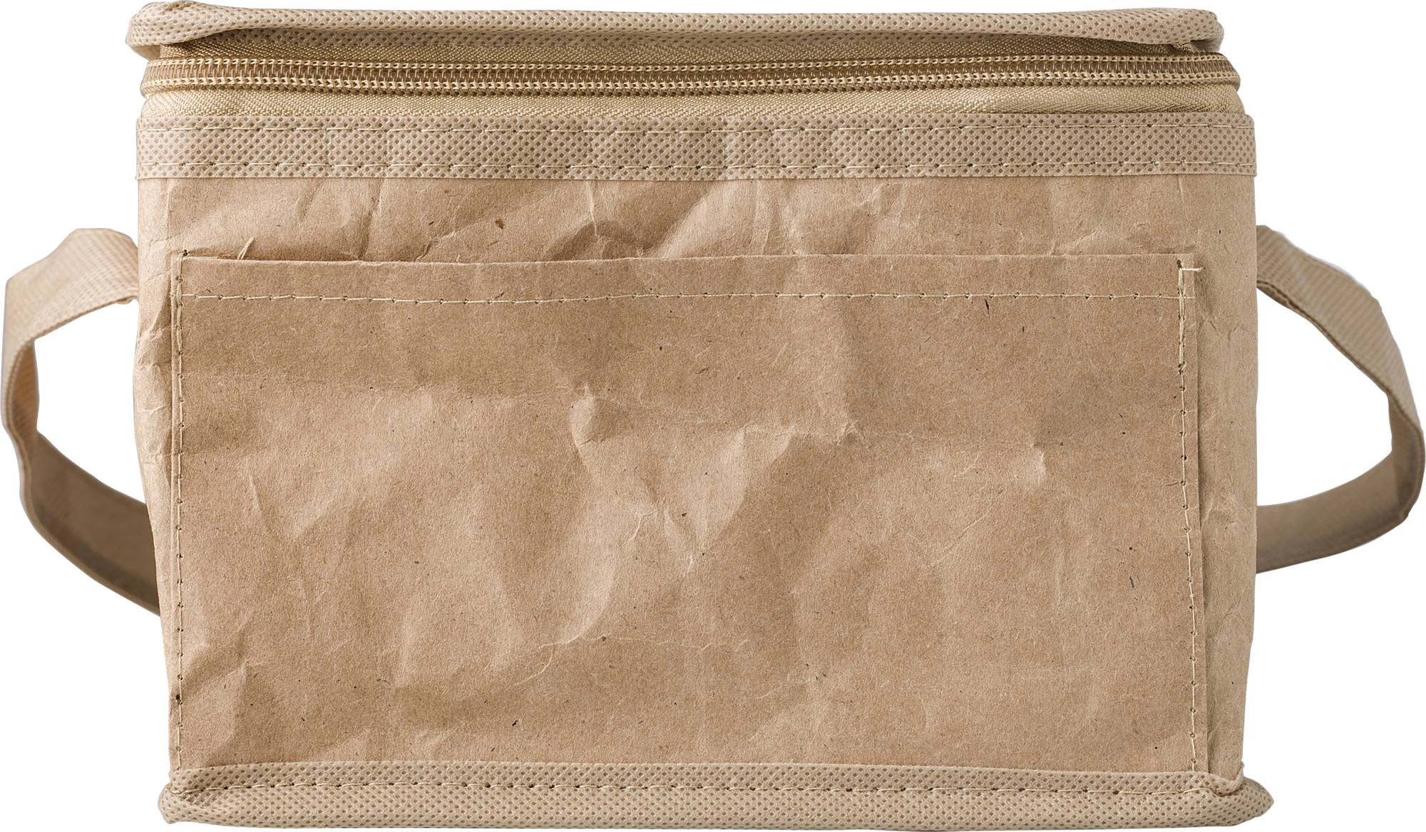 Paper (80 gsm) woven cooler bag with aluminium foil interior, for six 330 ml cans. With front pocket and strap. Capacity: 3 liters.