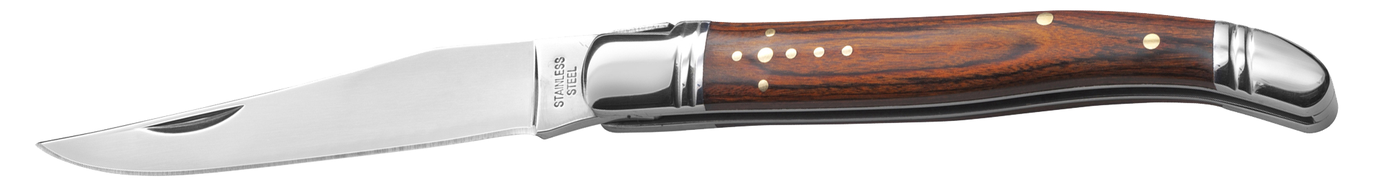 One piece steel and pakkawood pocket knife which is a material of exceptional quality and long lasting beauty.