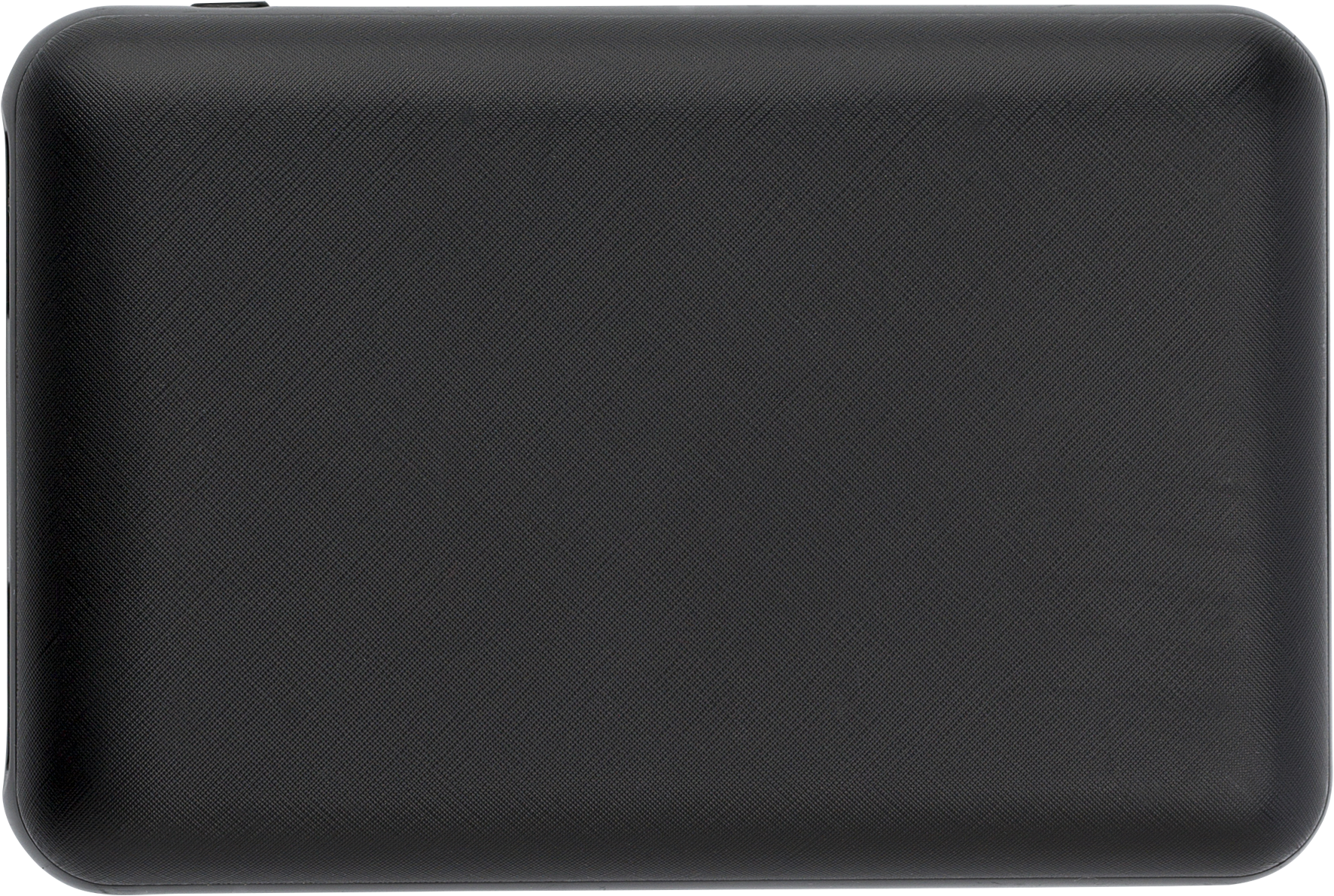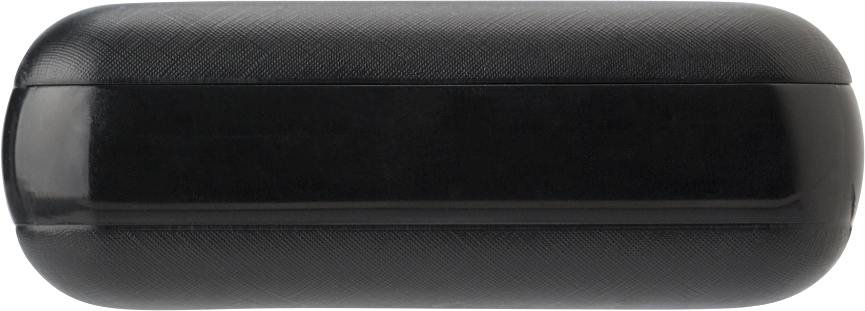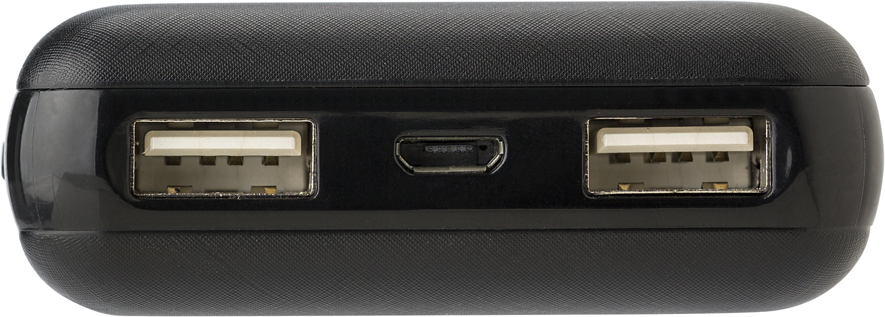 Plastic power bank with a capacity of 10.000 mAh. It has two standard USB ports and one micro USB port. Cable included. Input DC 5V/1500mA. Output DC 5V/1000mA, 2100mA.