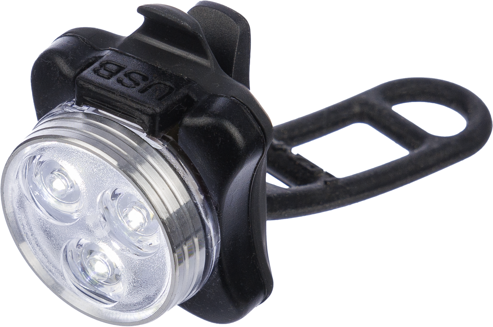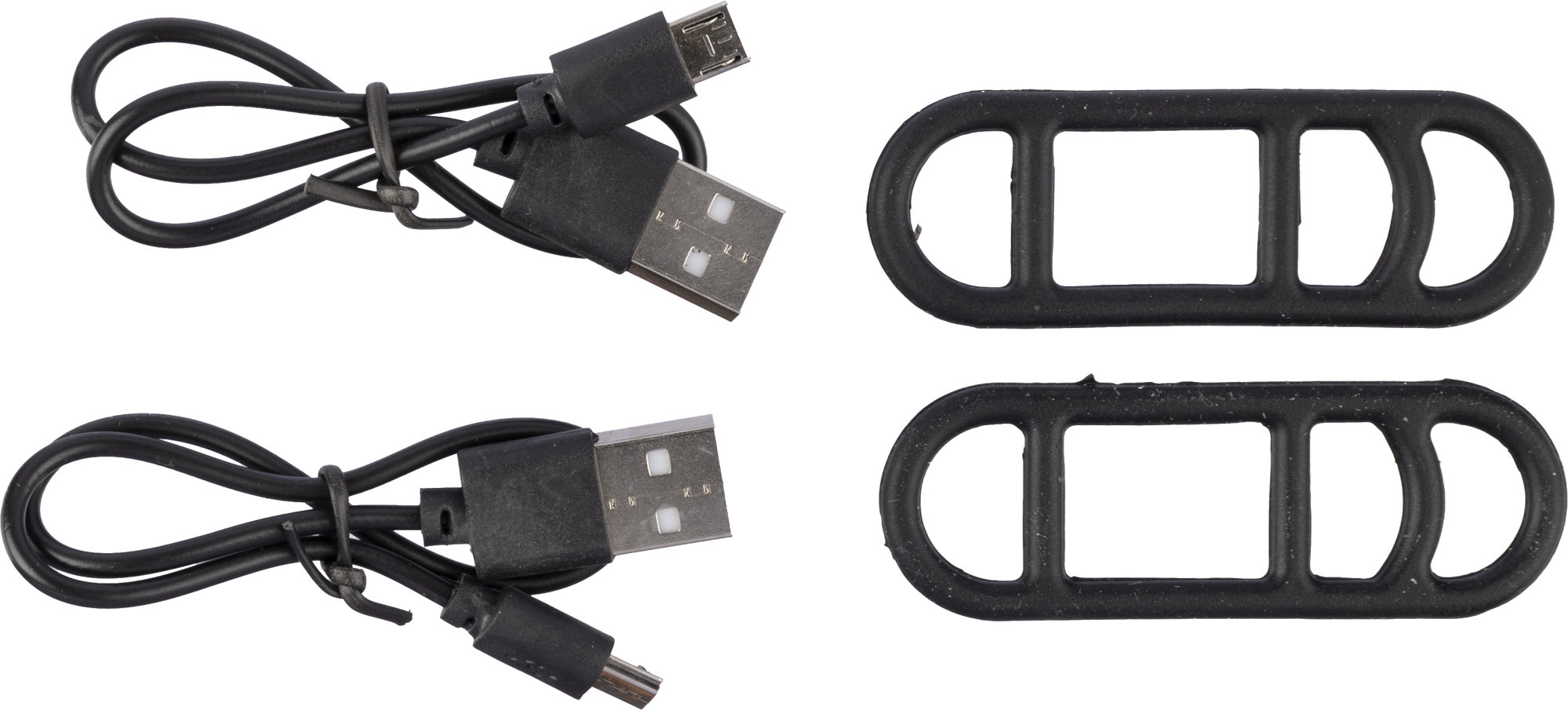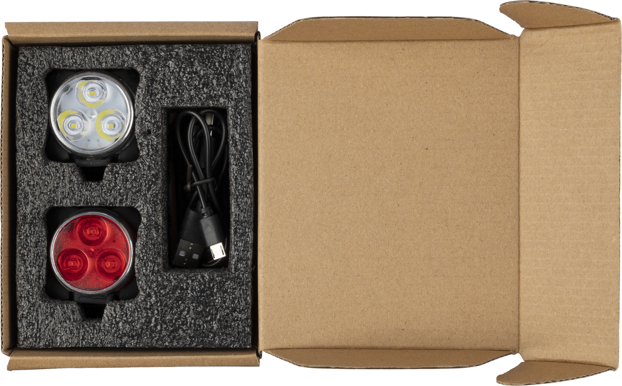 Rechargeable set of two bicycle lights featuring 3 LED lights with 4 lighting modes. Individually packaged in a brown carton box.
