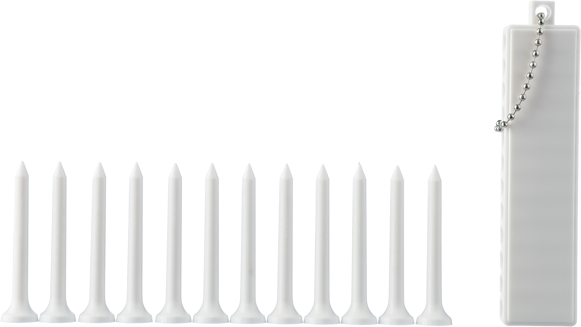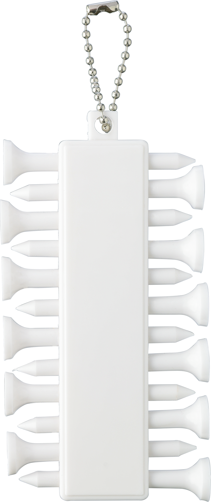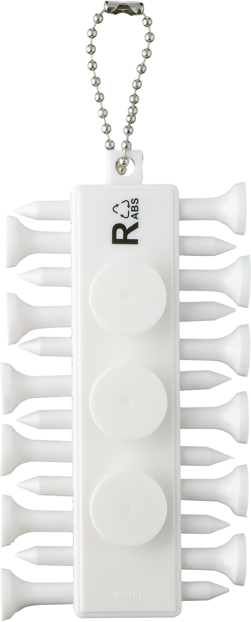 Recycled plastic golf tee set consisting of 12 tees in a compact holder with three ball markers with keychain. Includes the recycled plastic logo on the back.