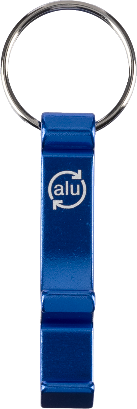 Recycled aluminium keyring with bottle opener and phone holder function. Includes a laser-engraved recycled aluminium logo.