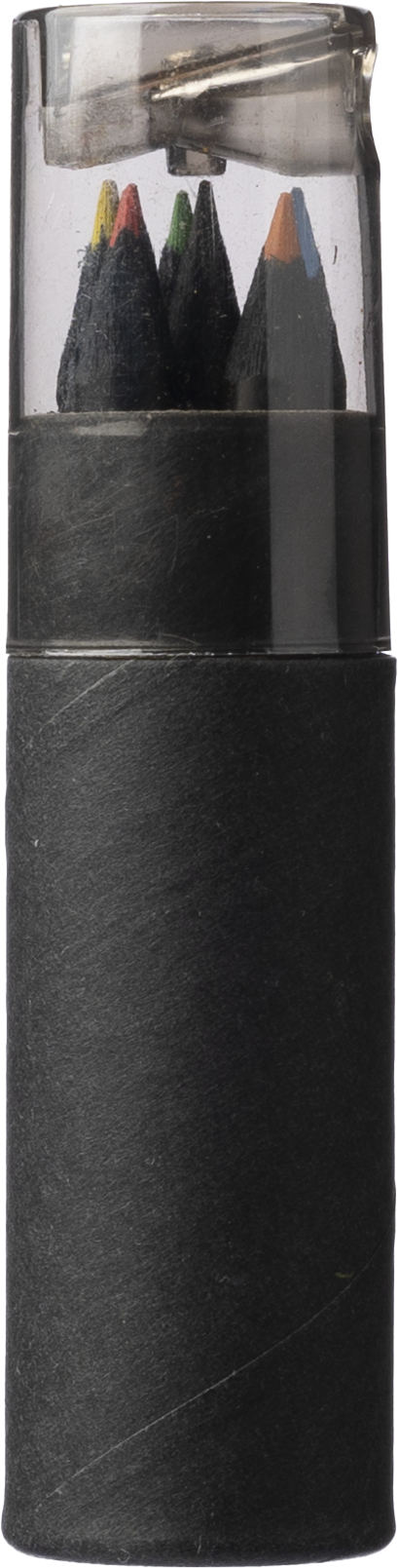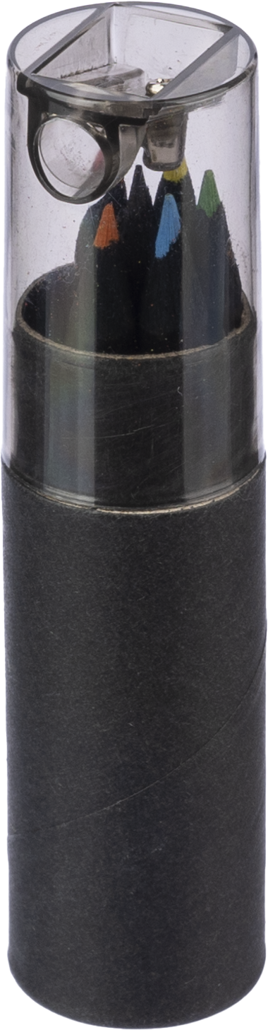 Recycled carton tube with 7 coloured pencils, and a sharpener integrated into the lid.