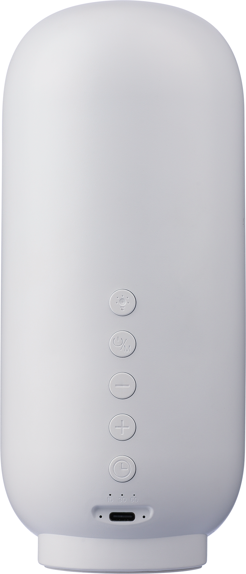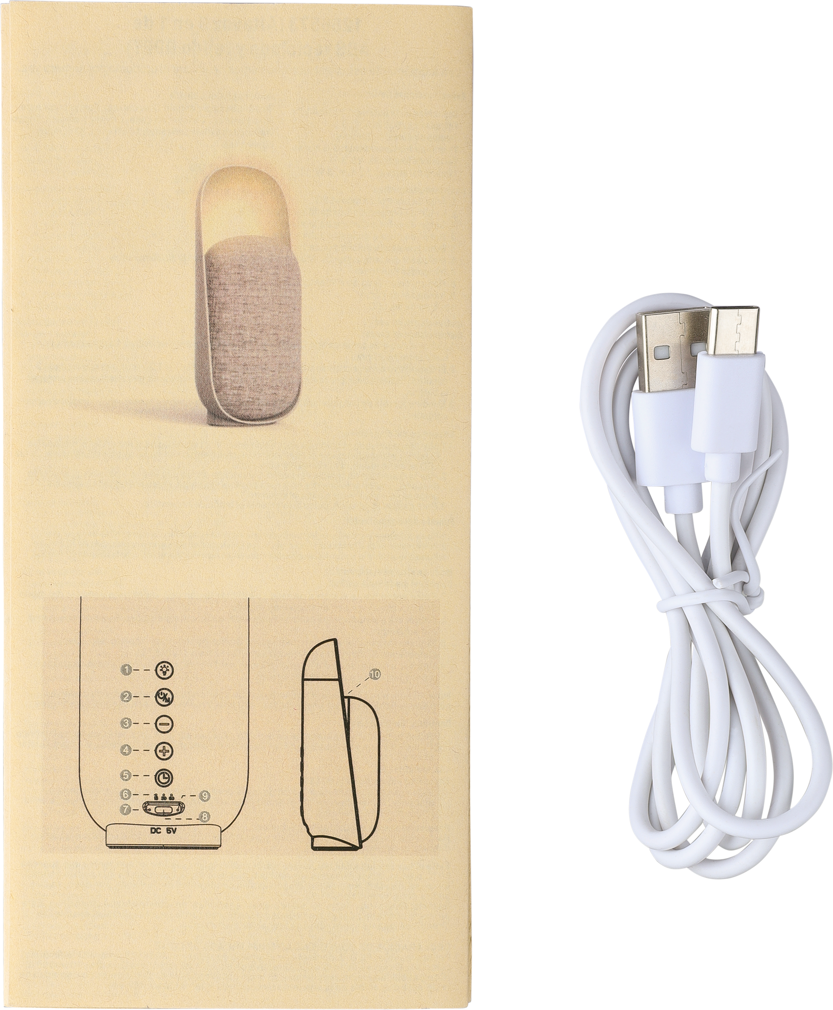 Recycled plastic and rPET fabric, 3-in-1 speaker with light and sleep therapy. Includes 3W speaker, wireless technology (version 5.3), six sleep sounds, timer, adjustable LED light, and 1200mAh battery.