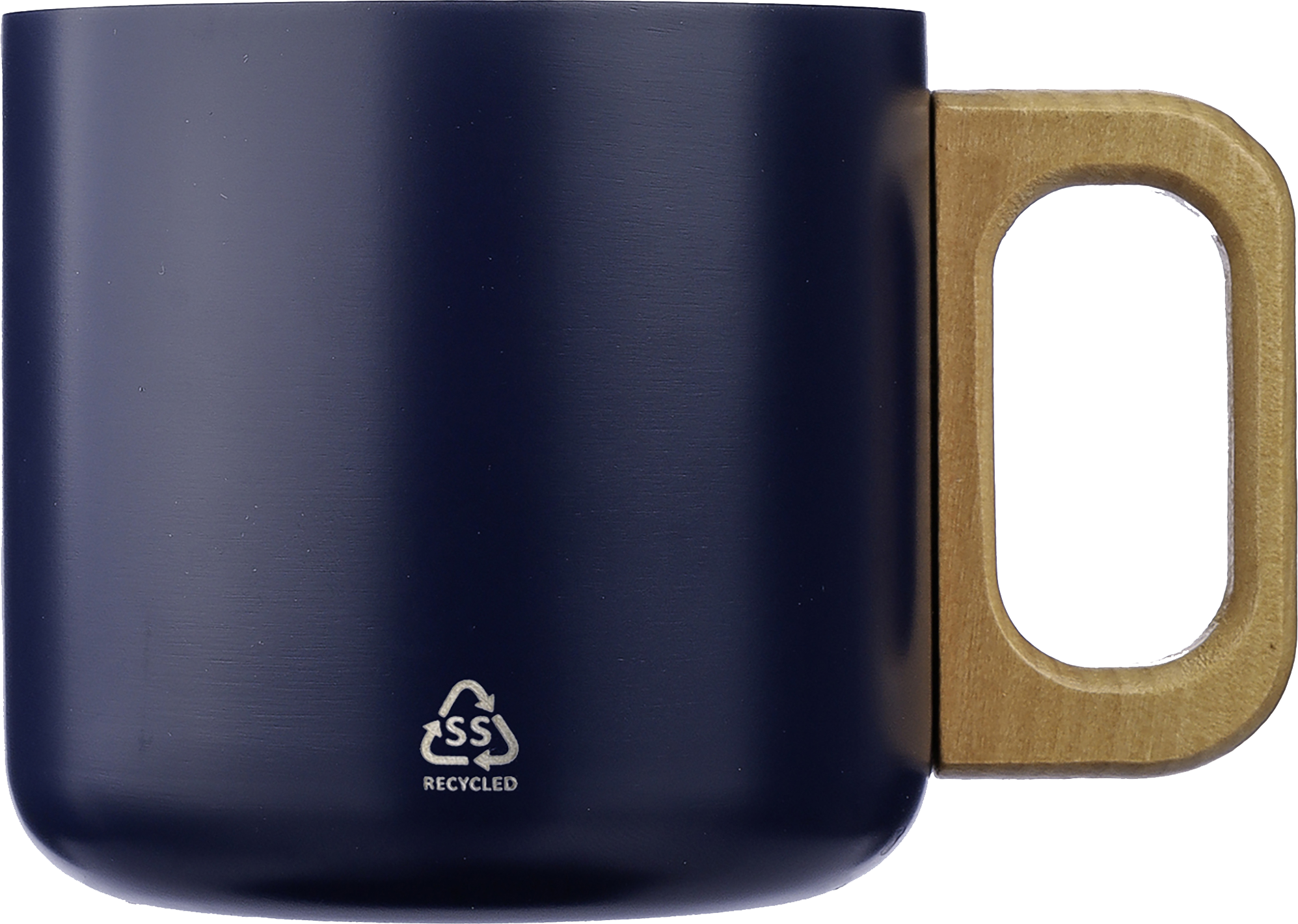 Recycled stainless steel double walled mug (400 ml) with wooden handle. Includes an engraved recycled stainless steel logo. Packaged in a brown cardboard box. Not dishwasher safe.
