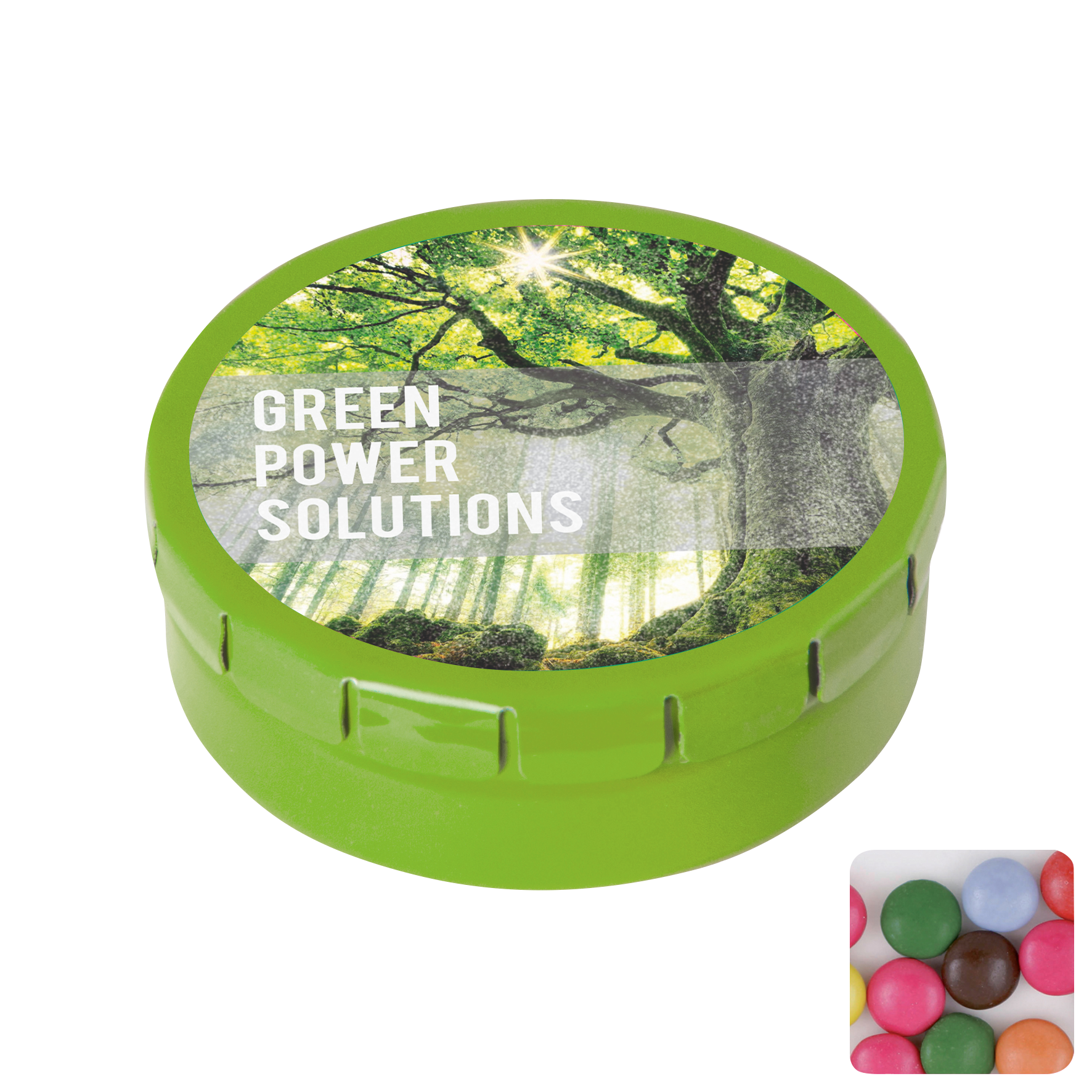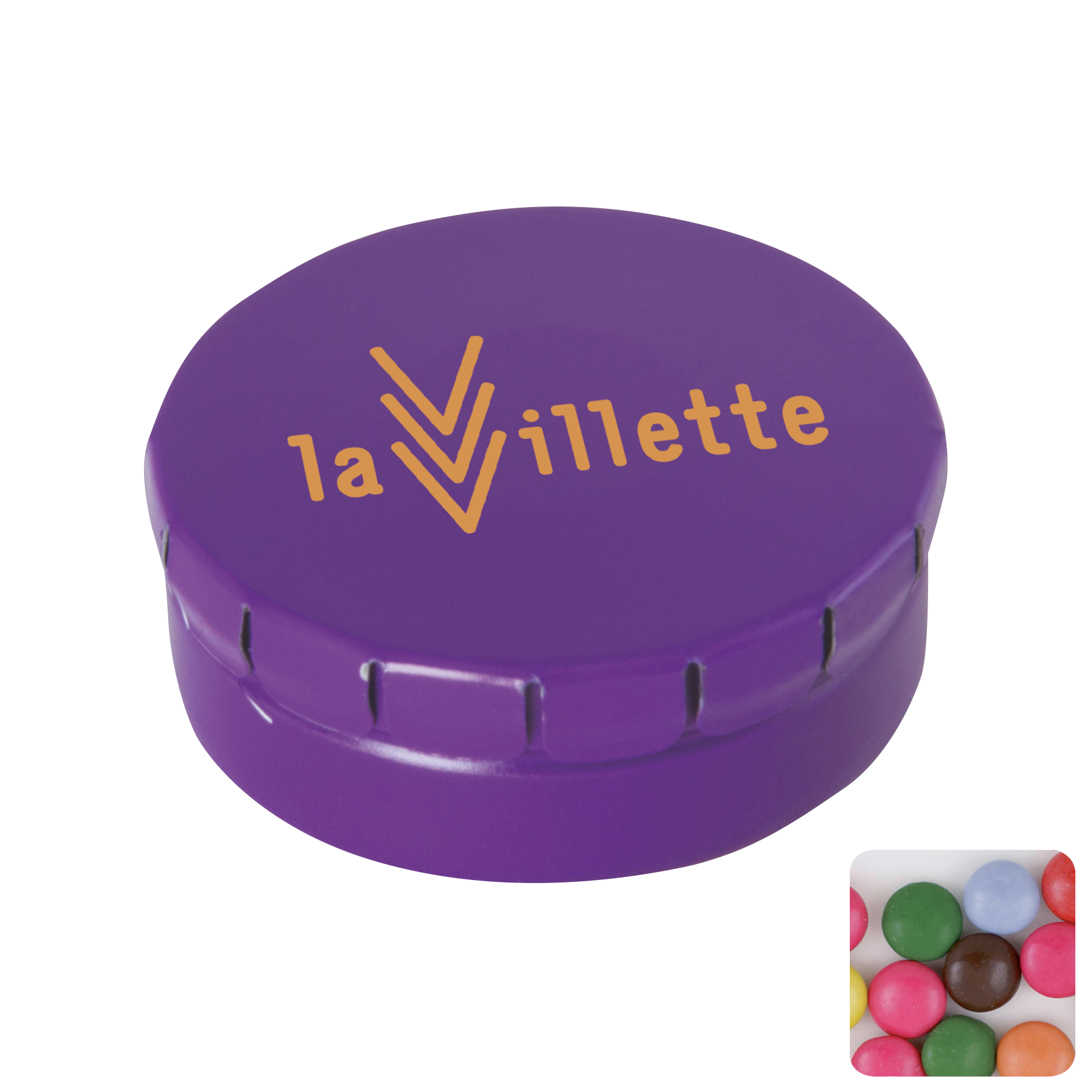Click tin with milk choco's. Supplied with a mix of chocolate colours.