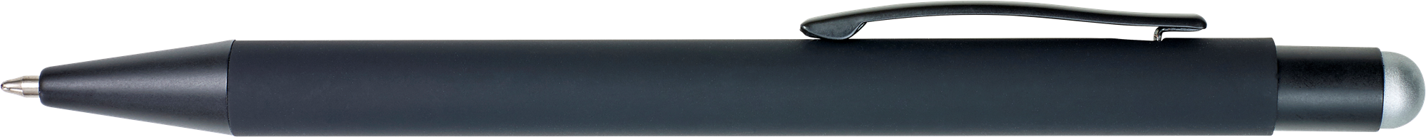 Rubberized black ballpen with blue ink and rubber tip to operate capacitive screens. The inside of the barrel and the rubber tip are coloured. When the item is lasered, the imprint will show in colour.