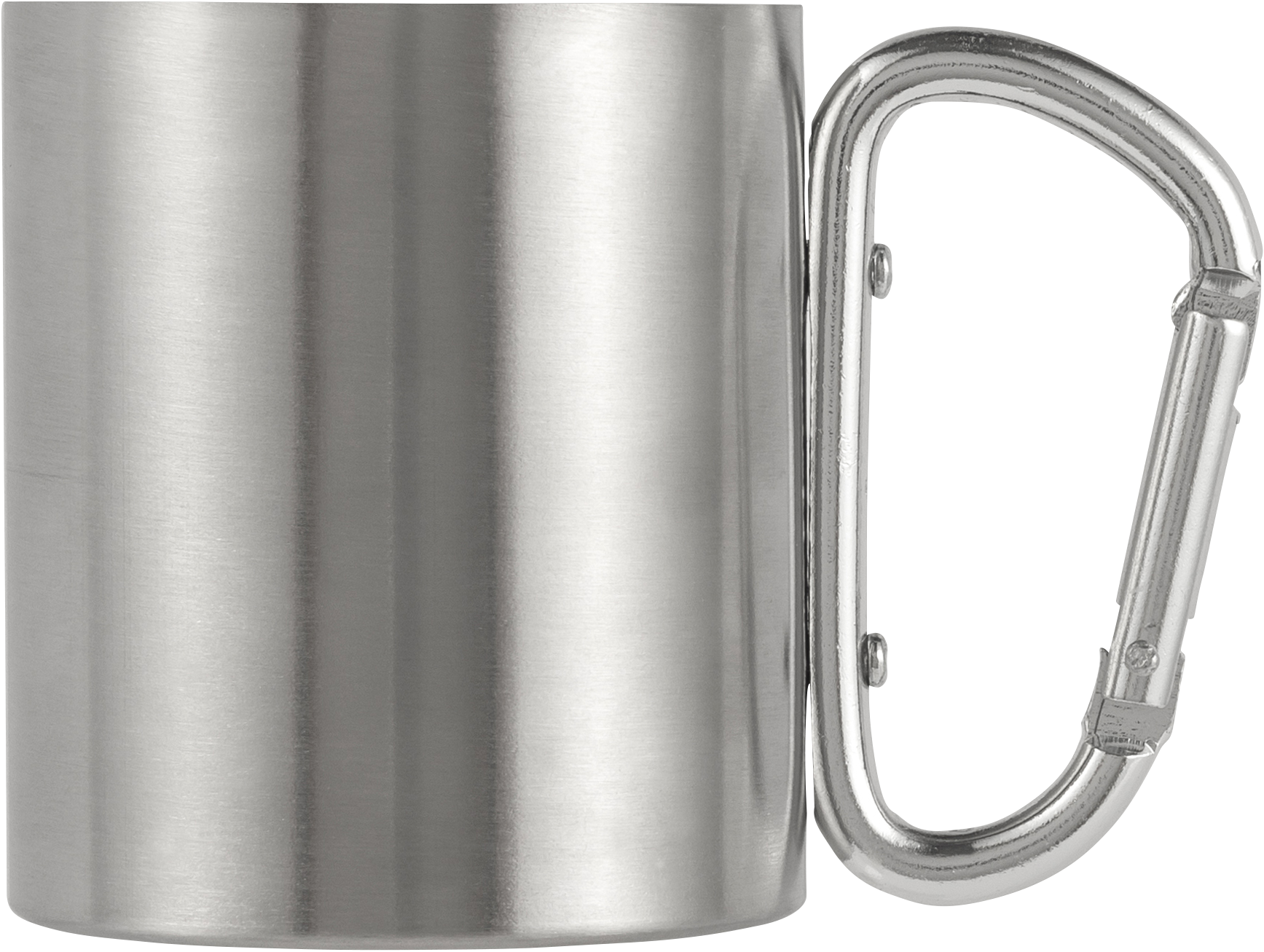 Double walled stainless steel travel mug with a carabiner handle. Not dishwasher safe.