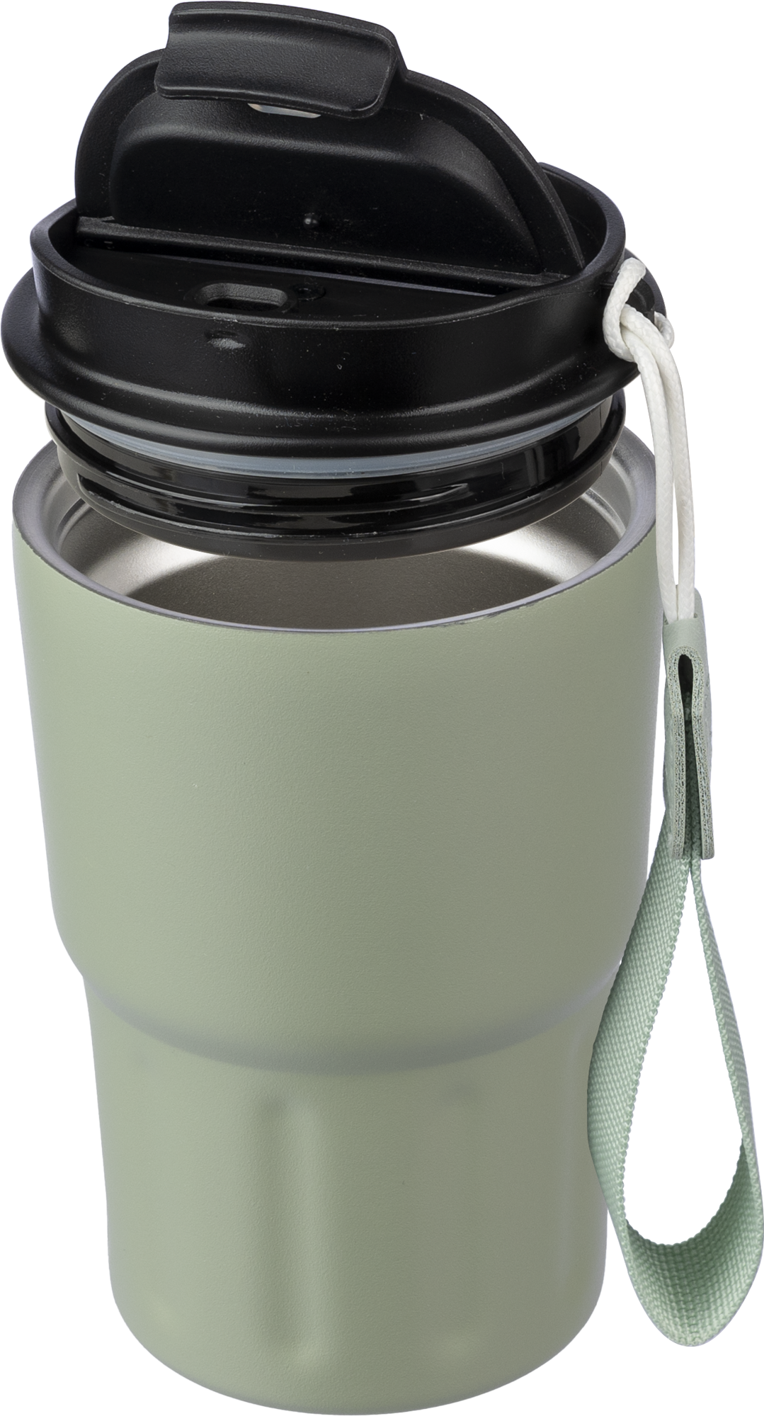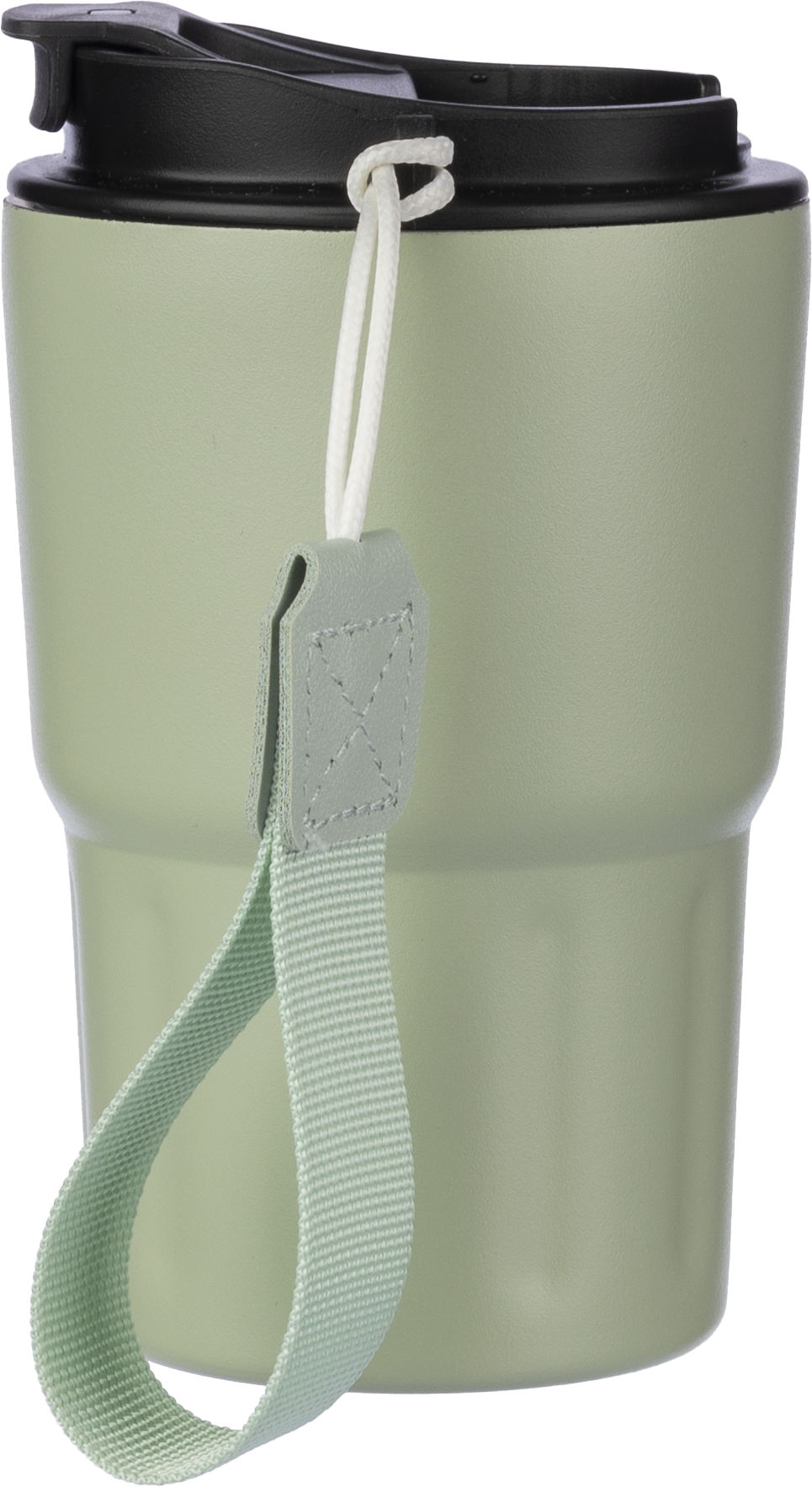 This stainless steel powder-coated double-walled drinking mug, with a 320 ml capacity, is designed to keep your beverages at the perfect temperature while on the go. Made with high-quality stainless steel: 304 inside and 201 outside. This mug ensures durability and great insulation. It features a convenient carrying band on the side for easy transport and comes with a secure PP lid to prevent spills. Each mug is individually packaged in a brown carton box, making it an excellent choice for daily use or as a thoughtful gift. Not dishwasher safe.