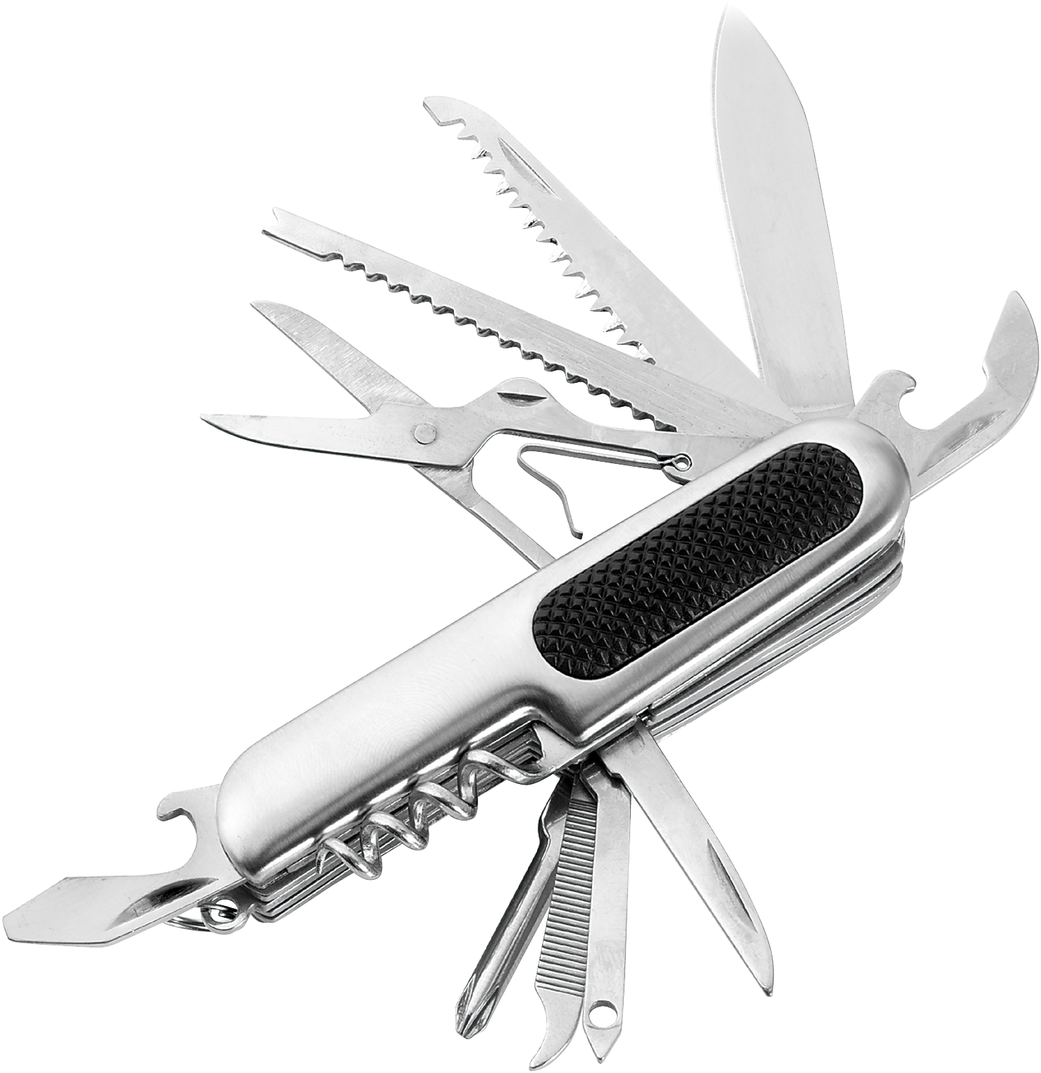 Stainless steel pocket knife with eleven functions. Includes a bottle opener, can opener/flat head screwdriver, corkscrew, Philips screwdriver, two saws, pair of scissors, two small knives, a large knife and a wire bender.