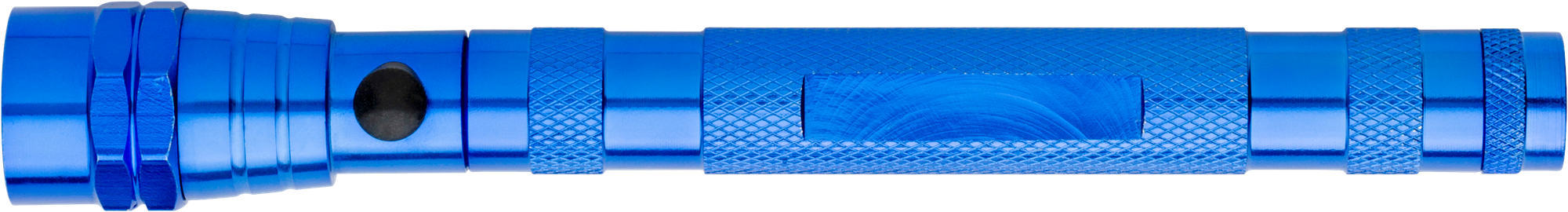 Aluminium torch with three LED lights, telescopic function and flexible hat, includes a strong magnet on one end for hanging from the hood of the car, and a flat area on the handle for printing purposes. Batteries included.
