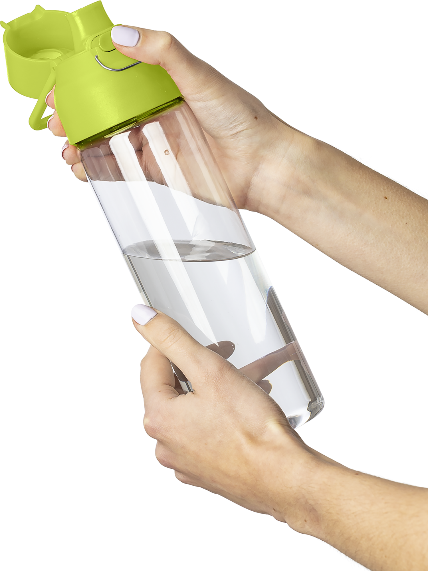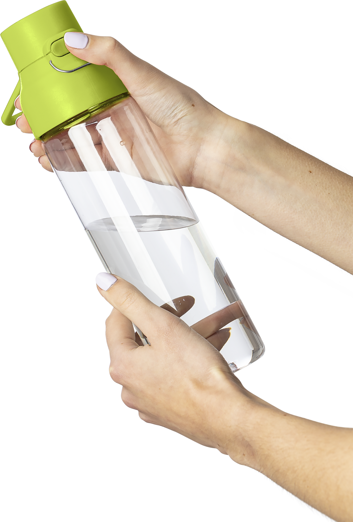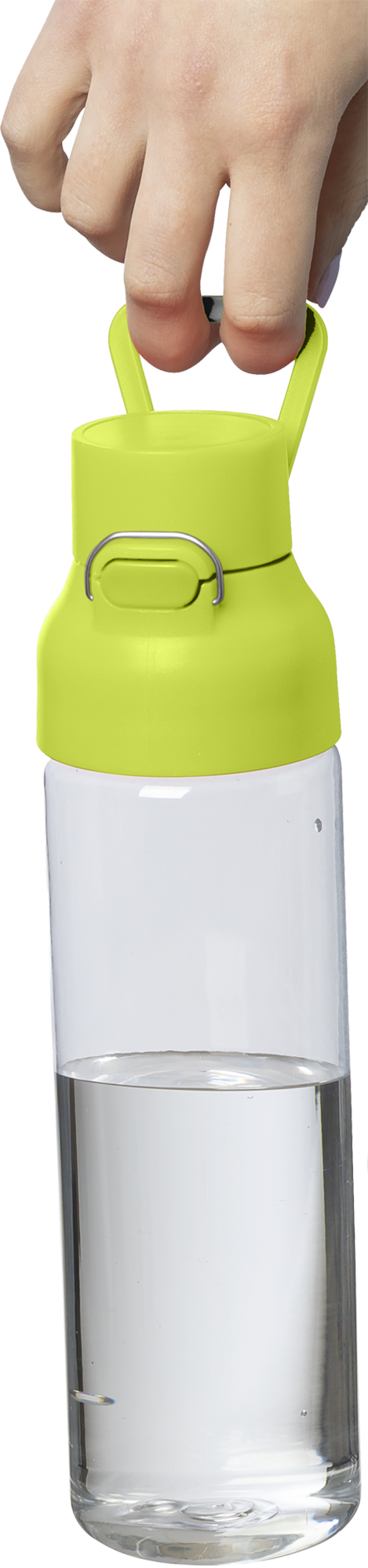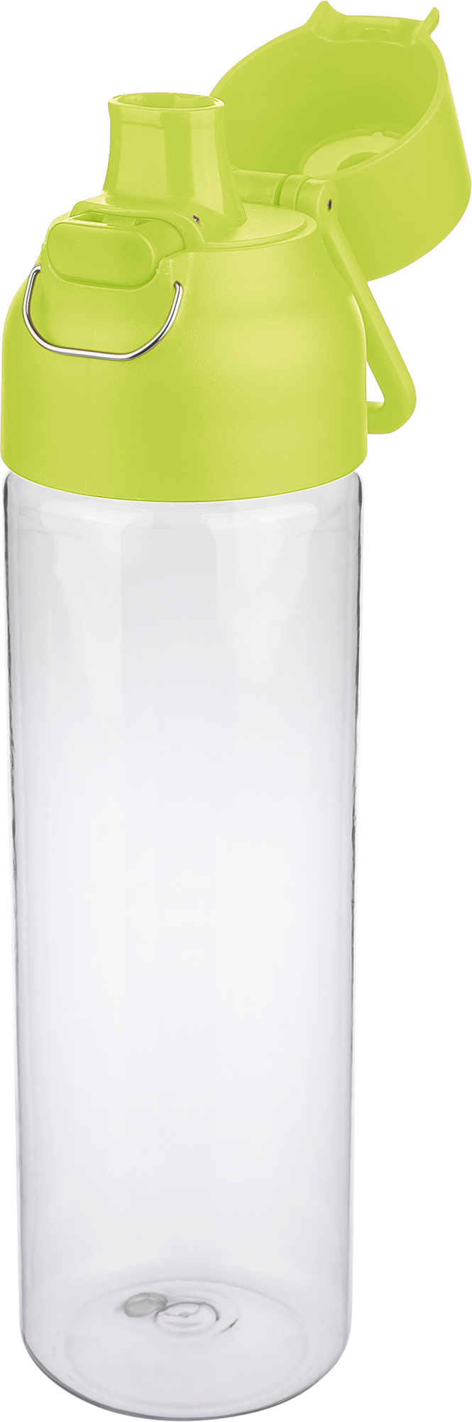 Transparent Tritan bottle with a coloured lid and 750 ml capacity. Includes a push button to open and a carrying handle.
