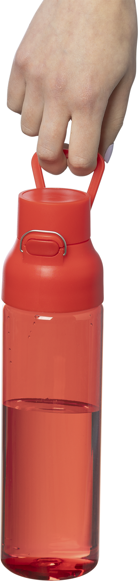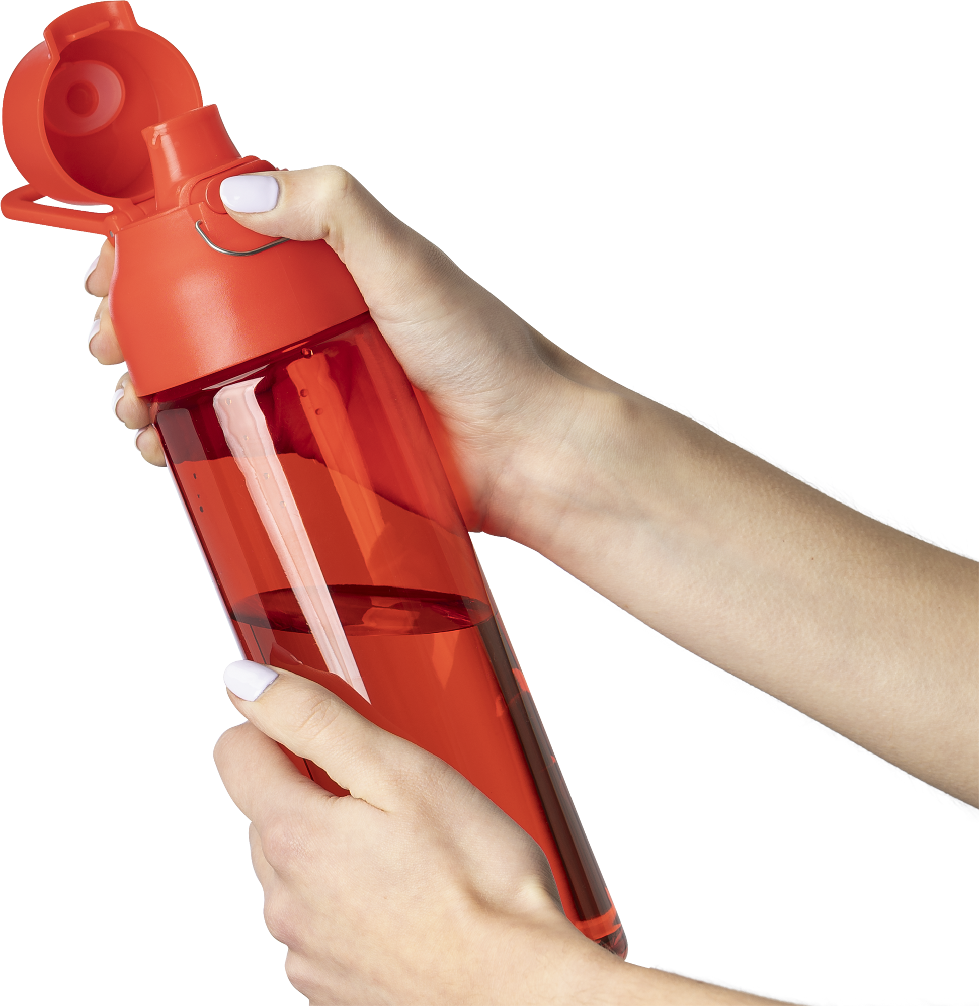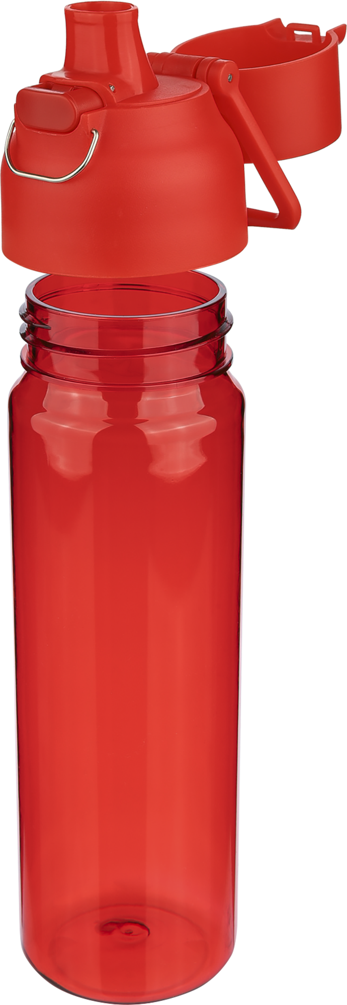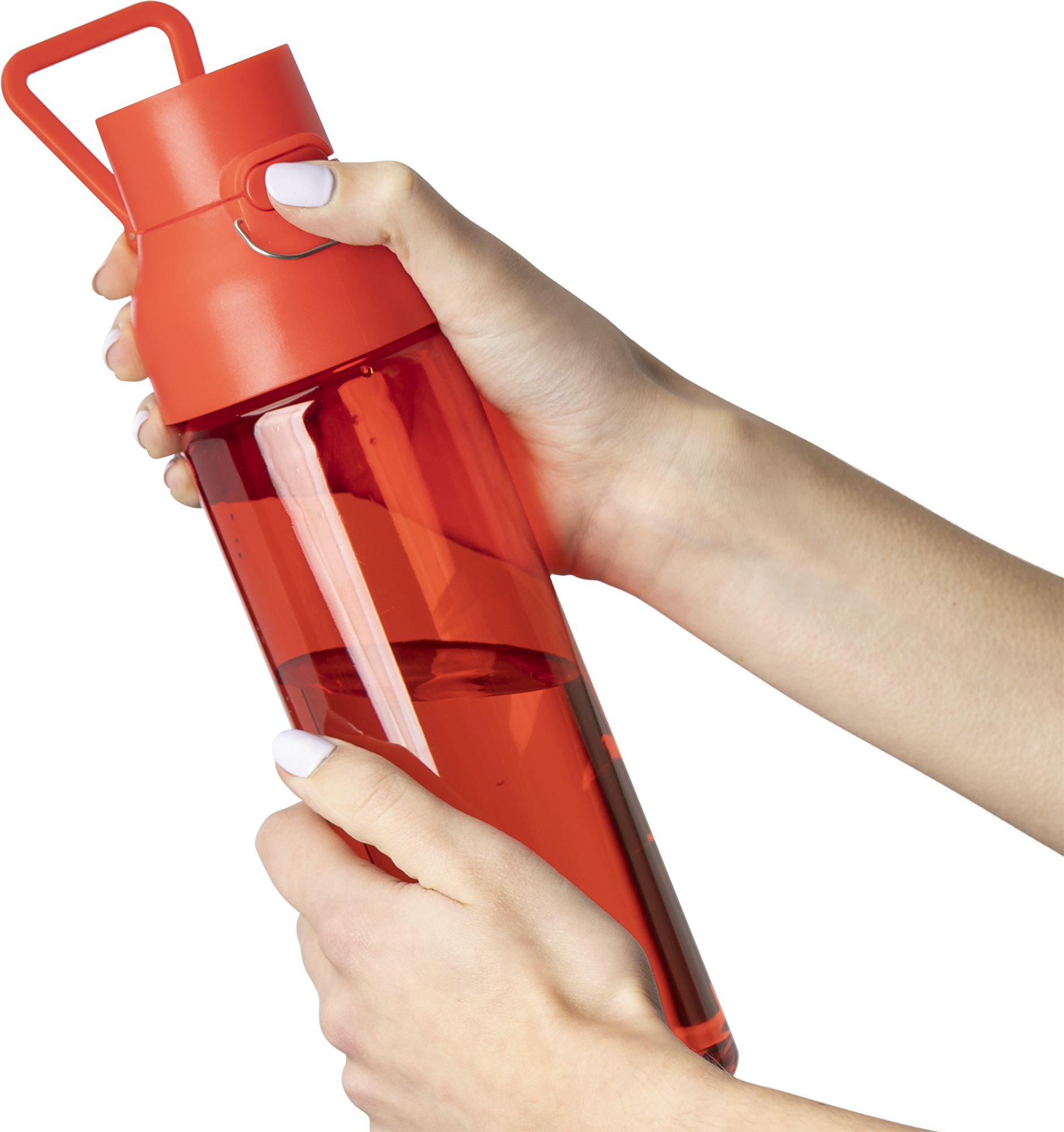 Tritan bottle with a 750 ml capacity. Includes a push button to open and a carrying handle.