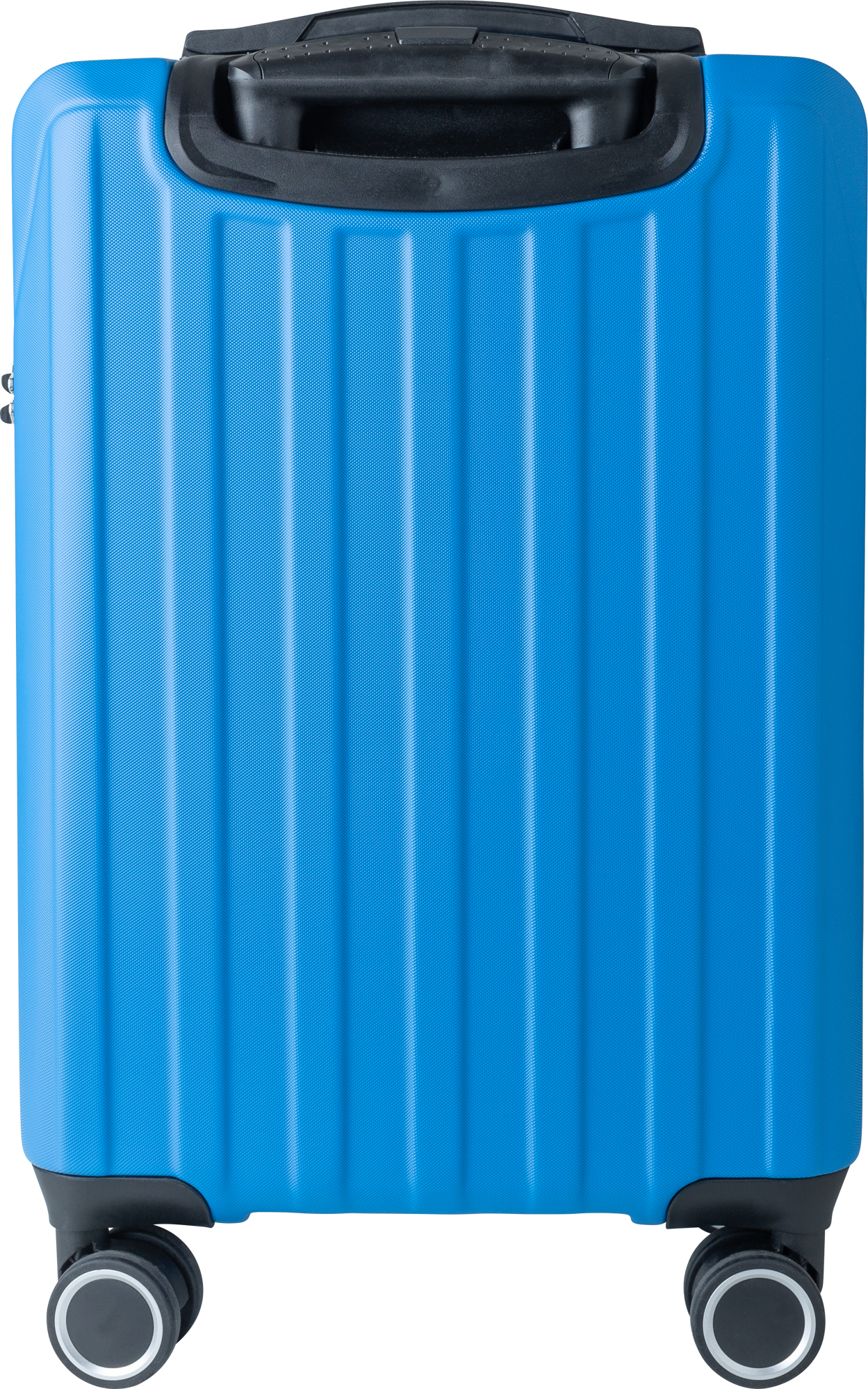 Hard-shell trolley with eight dual spinner wheels, a three-level telescopic handle, combination lock (non-TSA) and three interior compartments. Capacity: 30L. Individually packaged in a brown cardboard box.