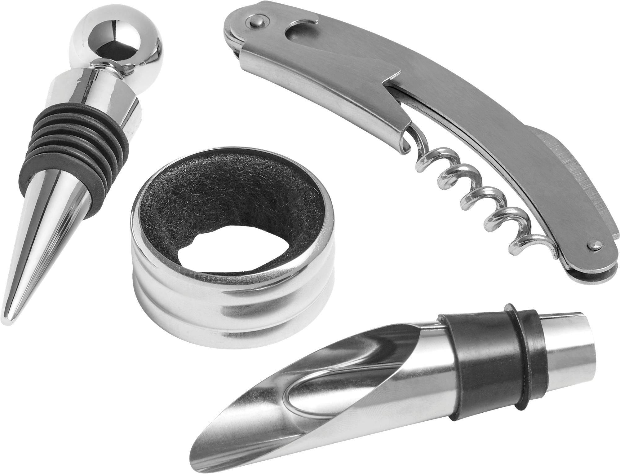 Four piece stainless steel wine set, consisting of: a bottle stopper, a corkscrew, a drip catcher and pouring spout with stopper. All items are organised in an ABS gift box.
